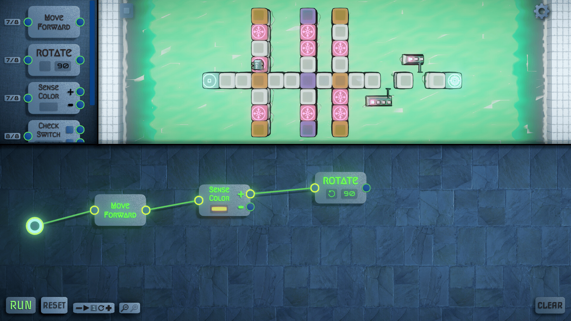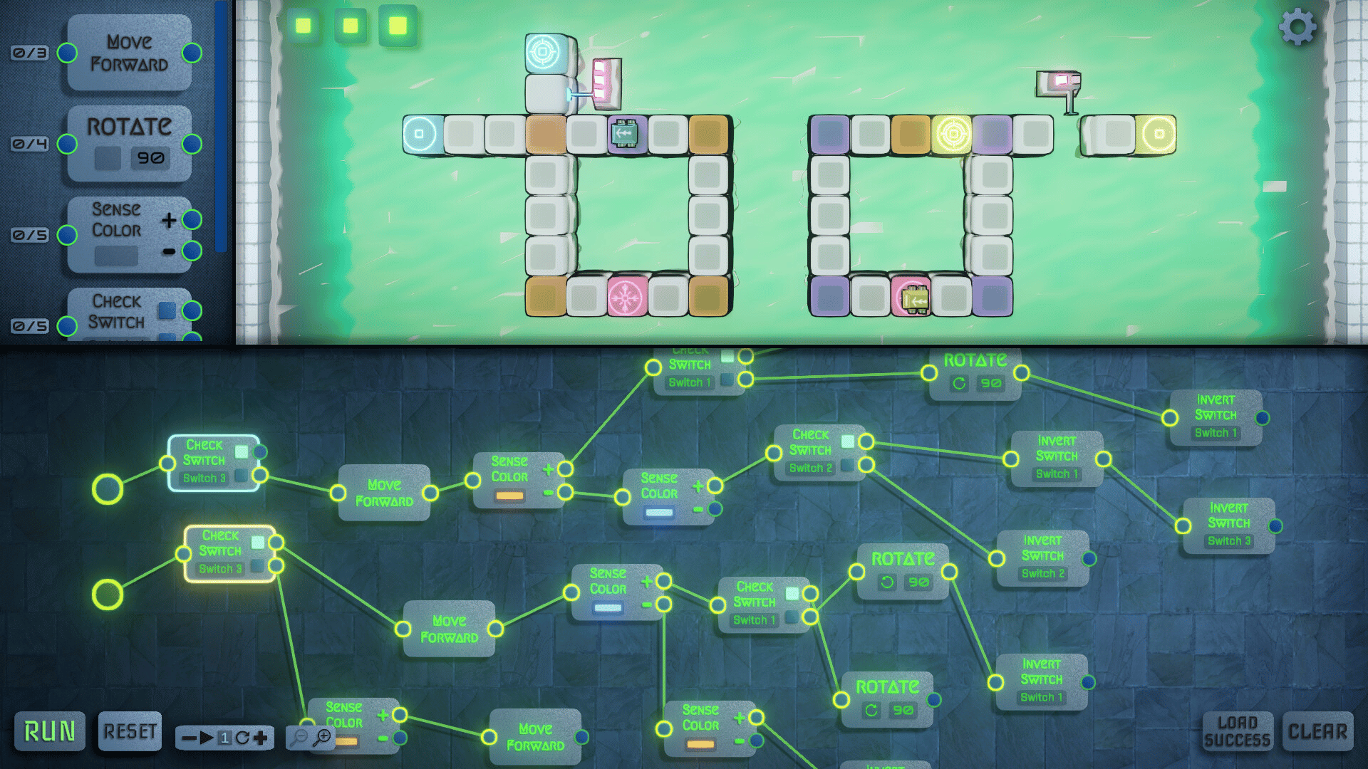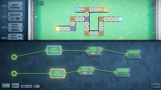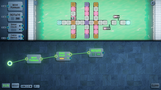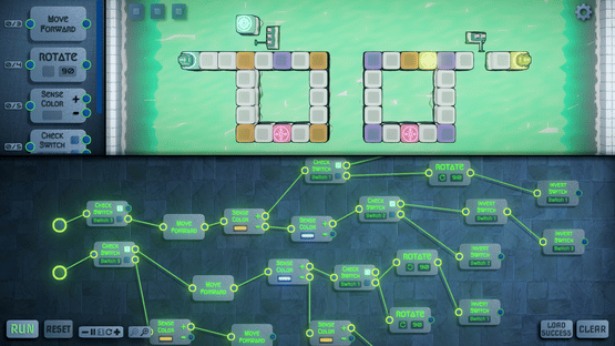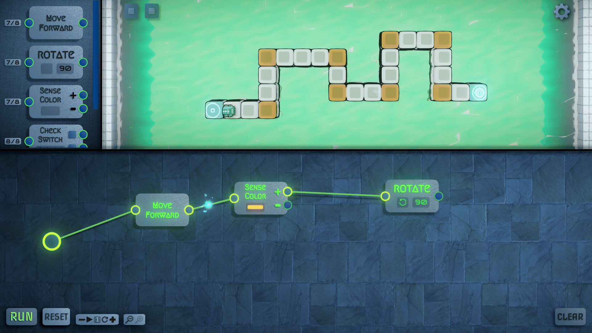 Program rovers with a visual Node Graph system to Navigate Complex Grids. Connect Movement, Sensor, and State Nodes to build custom logic. Use dropdowns to configure actions and wires to define flow.