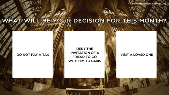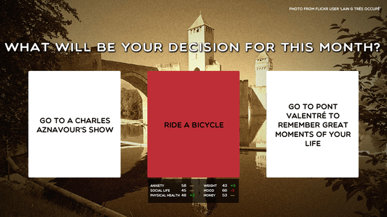 Cahors Sunset is a light-RPG in which you control the decisions of an old French man. Your goal is try to keep the main character alive for as long as you can through the decisions you make each month. Every action have wanted and unwanted effects on your character's health.