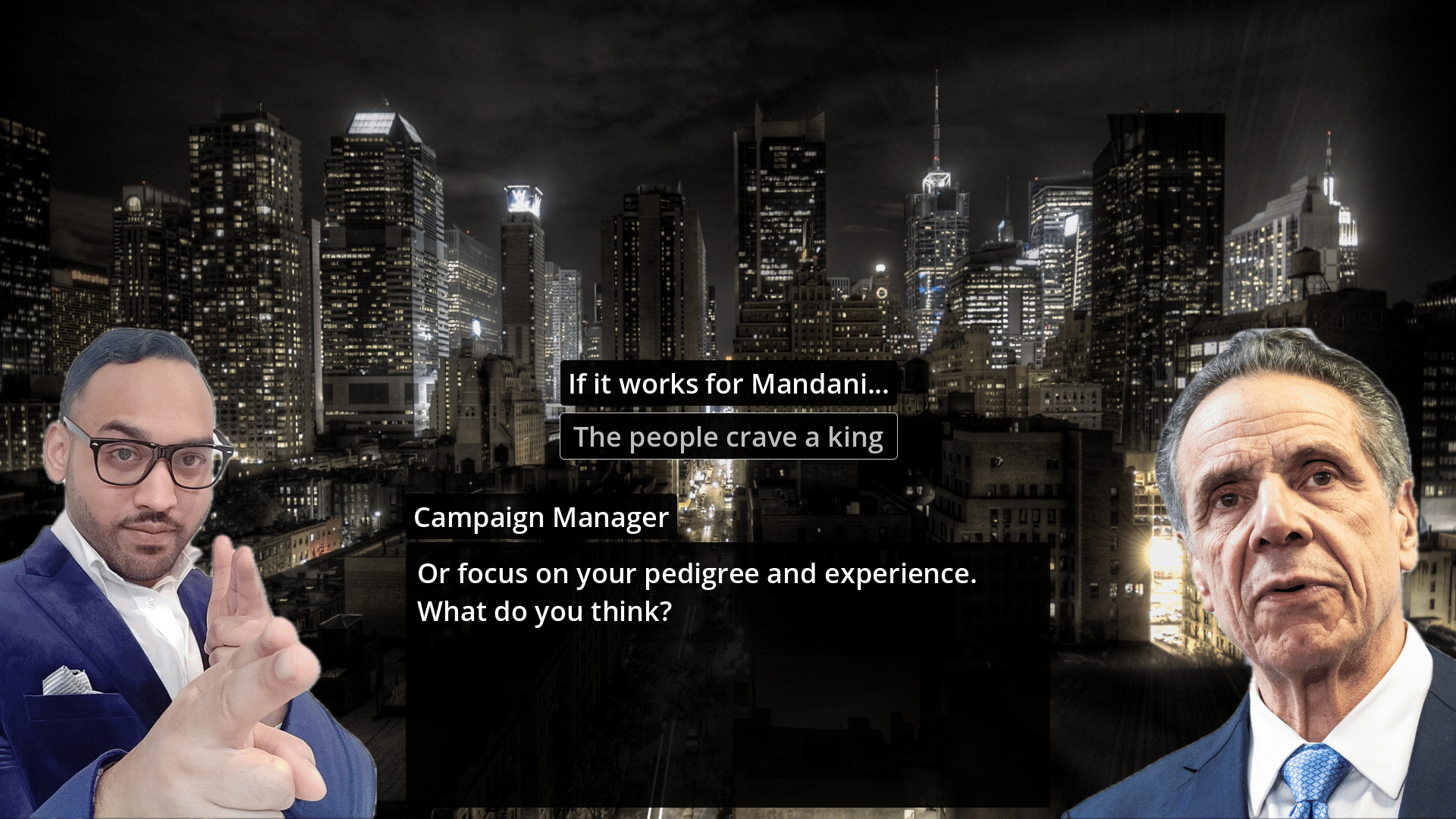 Can you beat Zohran Mamdani? You are Andrew Cuomo, disgraced former governor of New York State. Can you beat Zohran Mamdani in the New York mayoral race? Probably not. But try anyway! Six endings to discover and lots of Real Cuomo Facts to learn. Not affiliated with any political campaign or organization.