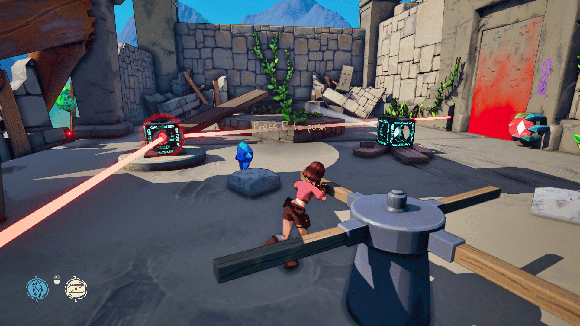 Ruby and the Lost Crystals is a calm third-person puzzle adventure where you swap between two characters to solve puzzles. Use physical interactions, magical projectiles, and object-swapping to unlock paths, reflect lasers, activate platforms, break obstacles, and explore ancient ruins.