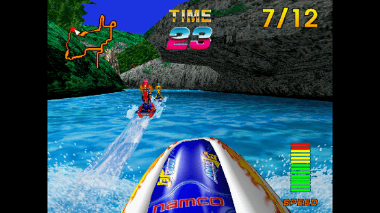 "AQUA JET" is a marine sports game released by NAMCO LIMITED (current Bandai Namco Entertainment Inc.) in 1996. This game stood out at arcades at the time thanks to its large jet ski-style cabinet. Savor the thrill of racing across shimmering waves under the blazing sun in a stunning, resort-like setting brought to life by the "System Super 22" hardware!