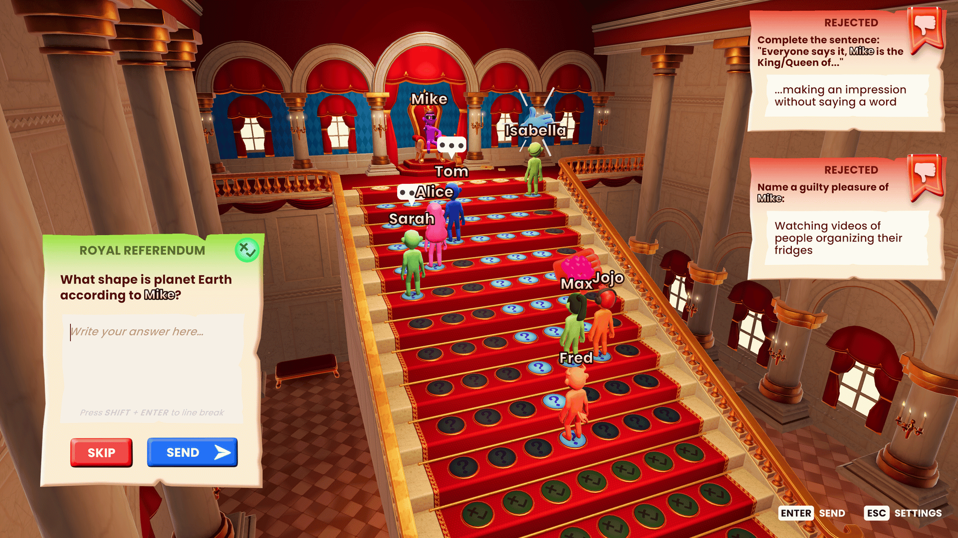 The You Quiz is a multiplayer game where the questions are about you! Be the King and judge your friends' answers about yourself. Or be a Courtier, guess their quirks, tastes, and dreams. Win favor, climb the ranks, become the new King. 3-8 players, online or local.