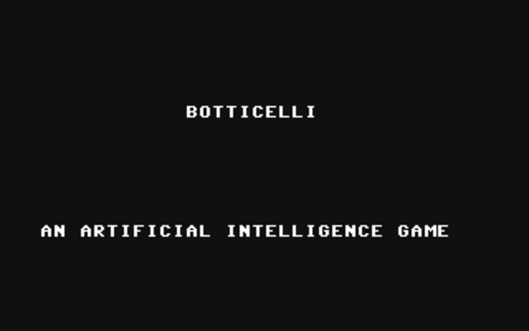 Botticelli is a 1 - 9 player logic learning and guessing game for multiple systems. The computer attempts to guess what object the player is thinking of, or vice versa, by asking a number of yes or no questions. There are multiple categories, and the player must teach the computer a variety of objects by teaching yes or no questions for differing objects. The player can define the number of guesses they have to name an object.