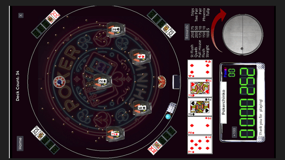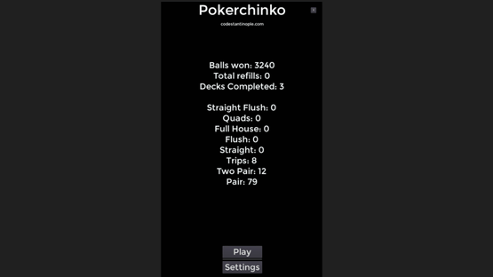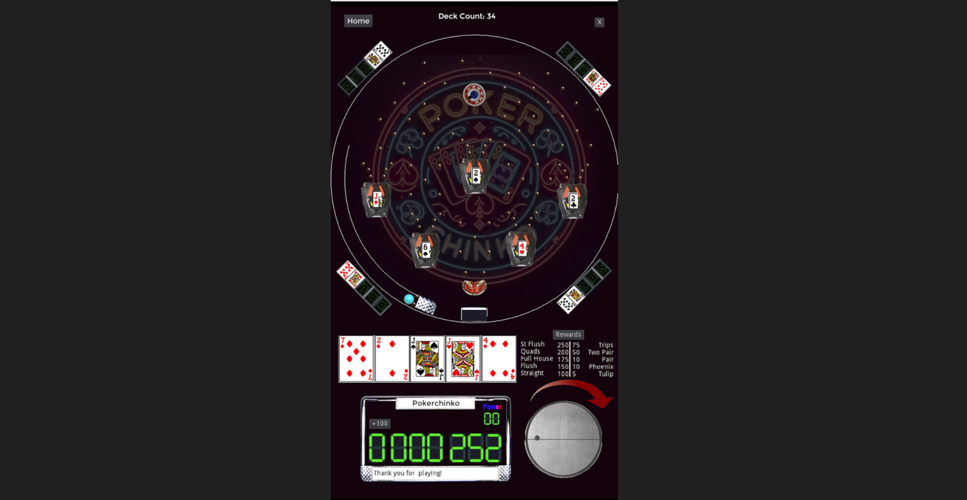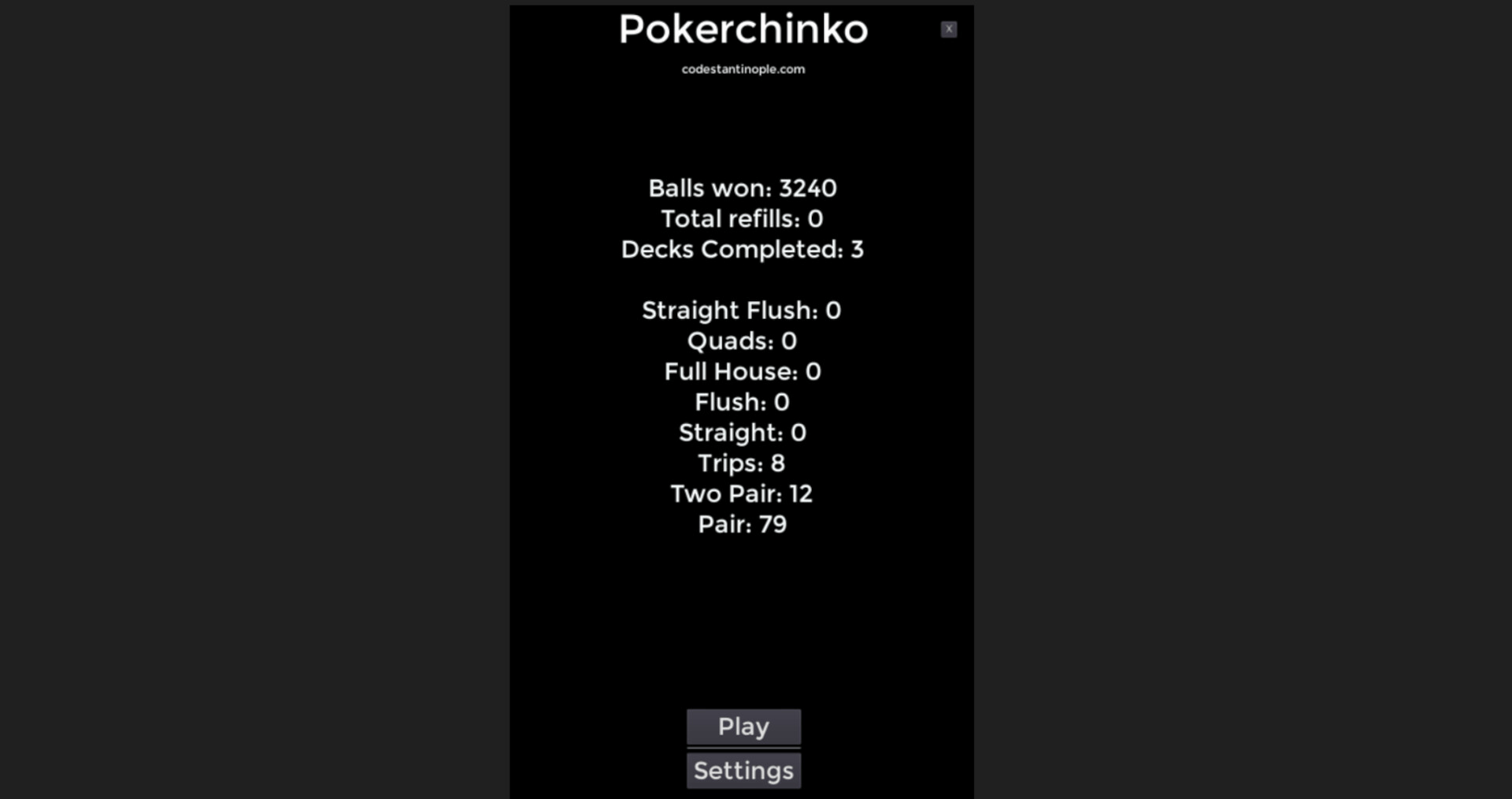 Pokerchinko is an old-school pachinko game. Your goal is to use your skills of precision to snag the card that makes the best poker hand. The better the hand, the better the rewards. Feel the tension as the balls bounce wildly around the playfield and the exhilaration of landing a fantastic hand.