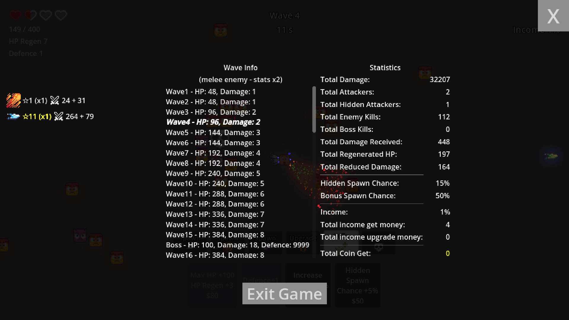 its very hard. You can check the statistics by pressing the ESC key or after the game over. Analyze why you couldn't stop the enemies and try to clear it next time If too difficult, collect coins and purchase permanent upgrades from the shop