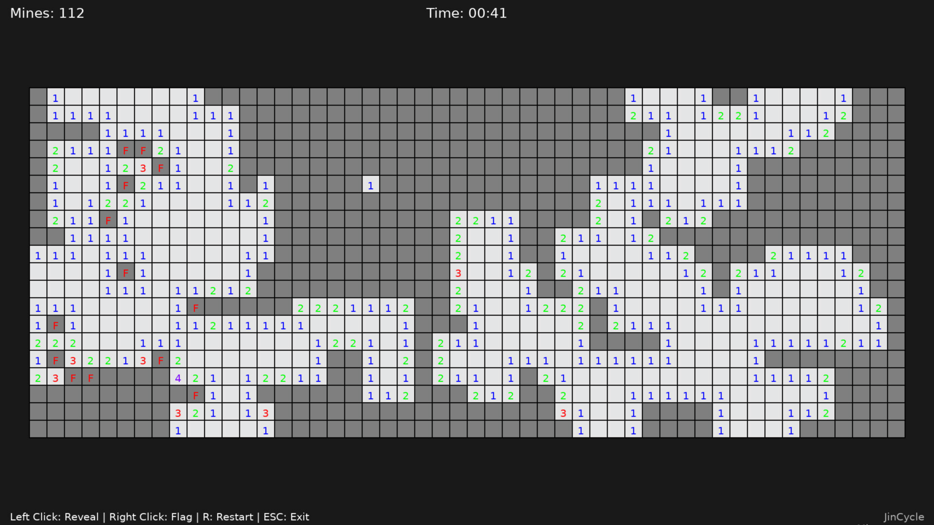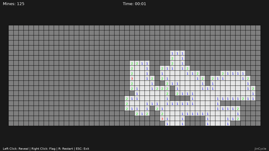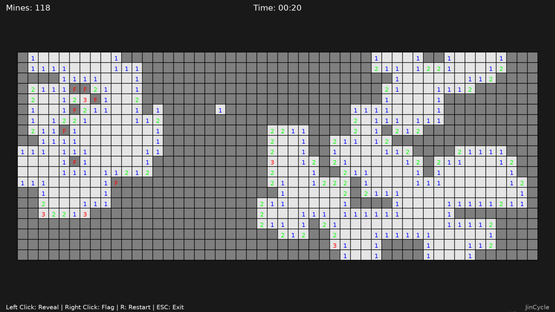 Let's play MinePuzzle in an area of 50*20. The number of bombs around you will be displayed, so use that as a hint and right-click to mark where you think the bombs are. When all the cells are open, the game is clear!