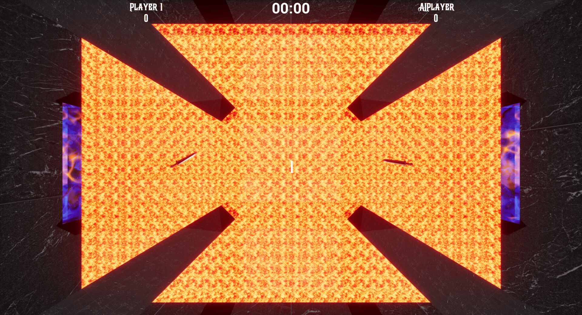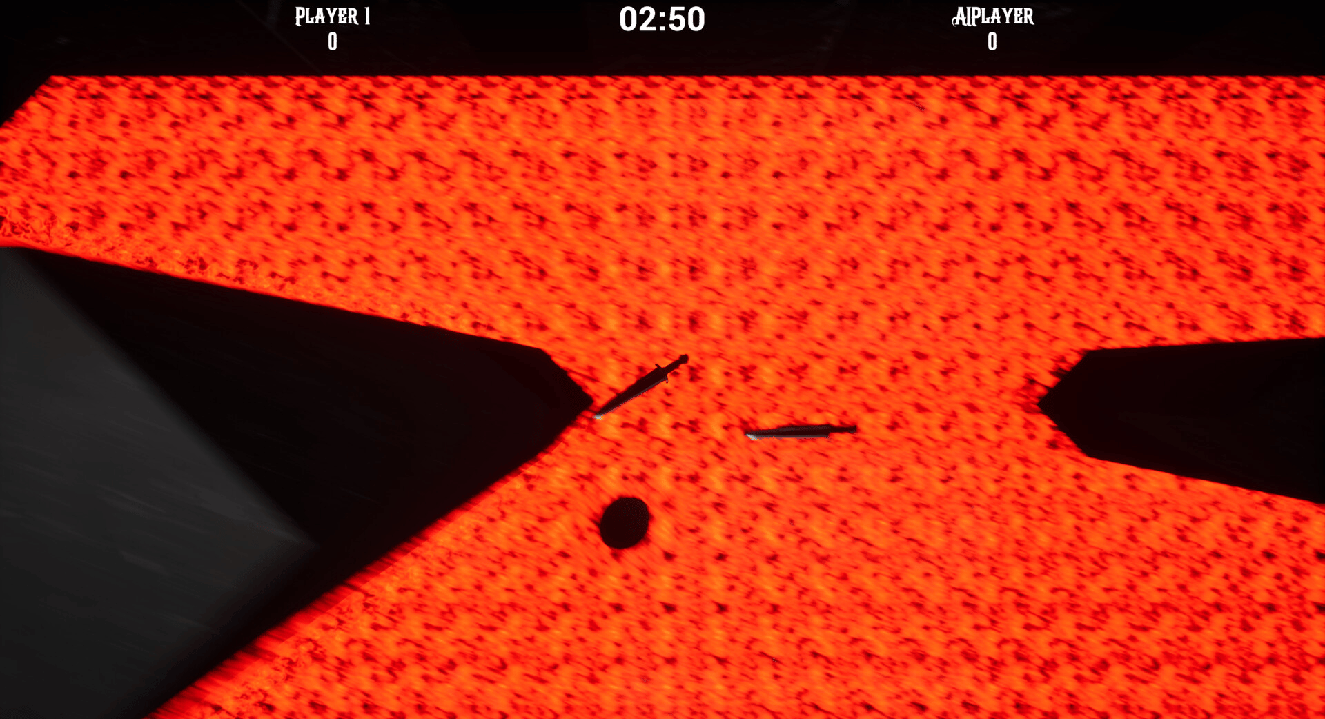 Top-down 3D air-hockey-style game requiring only your mouse. Using swords instead of mallets, score goals by hitting the puck into your opponent's goal, or prevent goals by hitting your opponent away from the puck. The player with the most goals after 3 minutes wins!