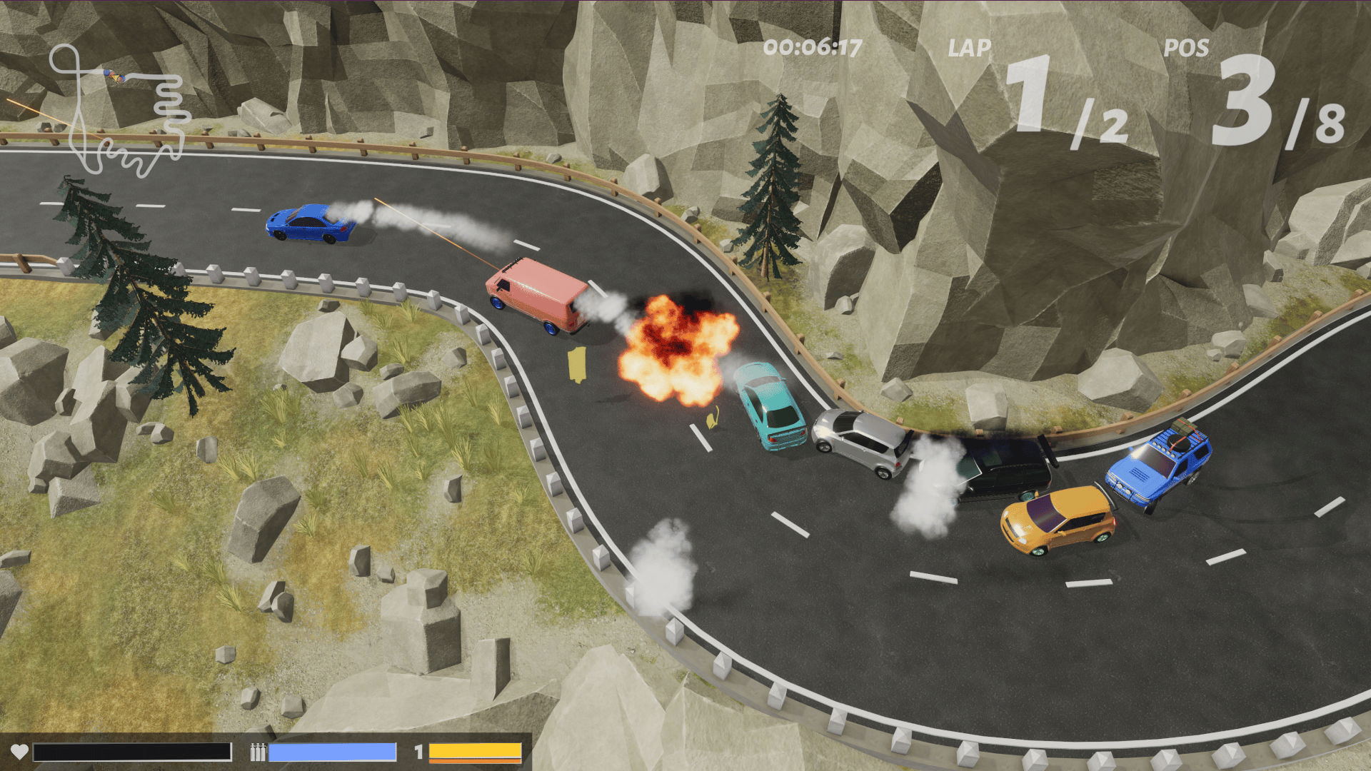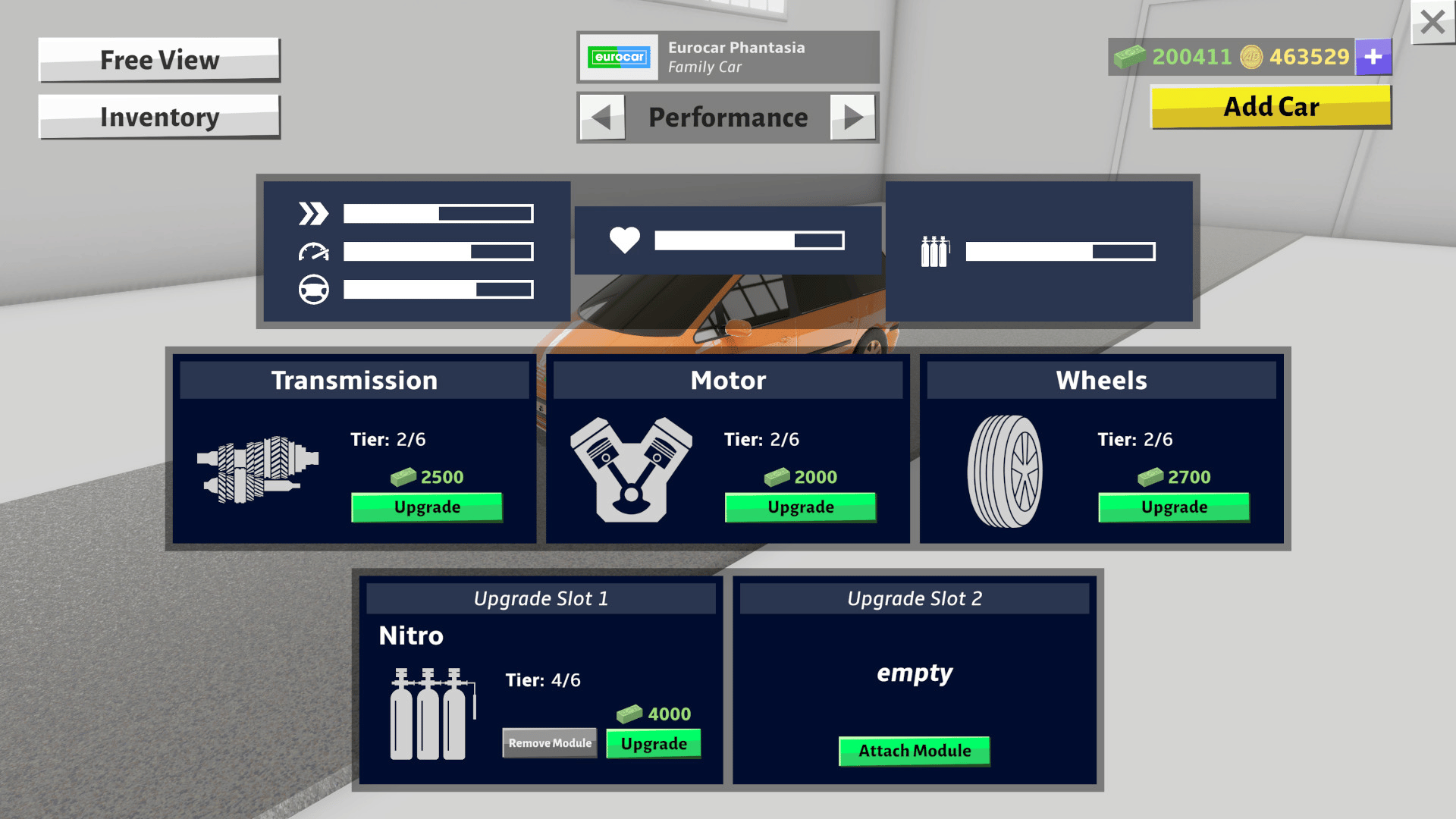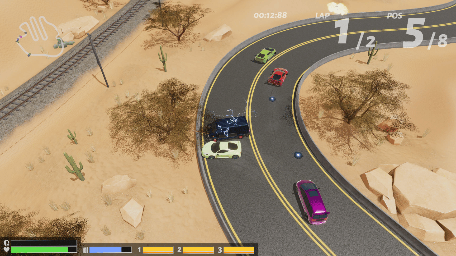 Top-down racing with armed cars. Upgrade performance, attach weapons and customize the visuals of your car. Build a huge parking lot and let your vehicle fleet grow.