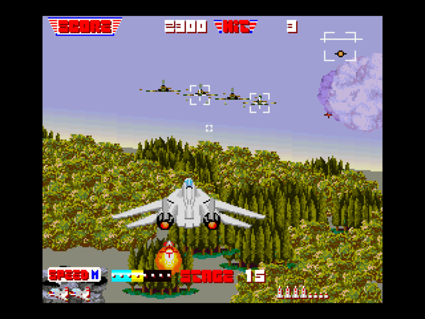 Muster up all the skill, reflexes and guts you've got. Because inside your F-14 Thunder Cat, you're going to need all that - and more. Blast laser-directed, anti-aircraft fire at enemy planes. Dodge heat-seeking missiles with fancy flywork, like dips, turns and barrel rolls. Come head to head with the infamous Flying Fortresses (the toughest of all enemies) and dogfight your way through, to a nanosecond of safety. And if you make it far enough, a fuel tanker will be waiting for you. Dock successfully and you'll replenish valuable energy and ammunition. Despite its title, this game is actually a port of After Burner II.