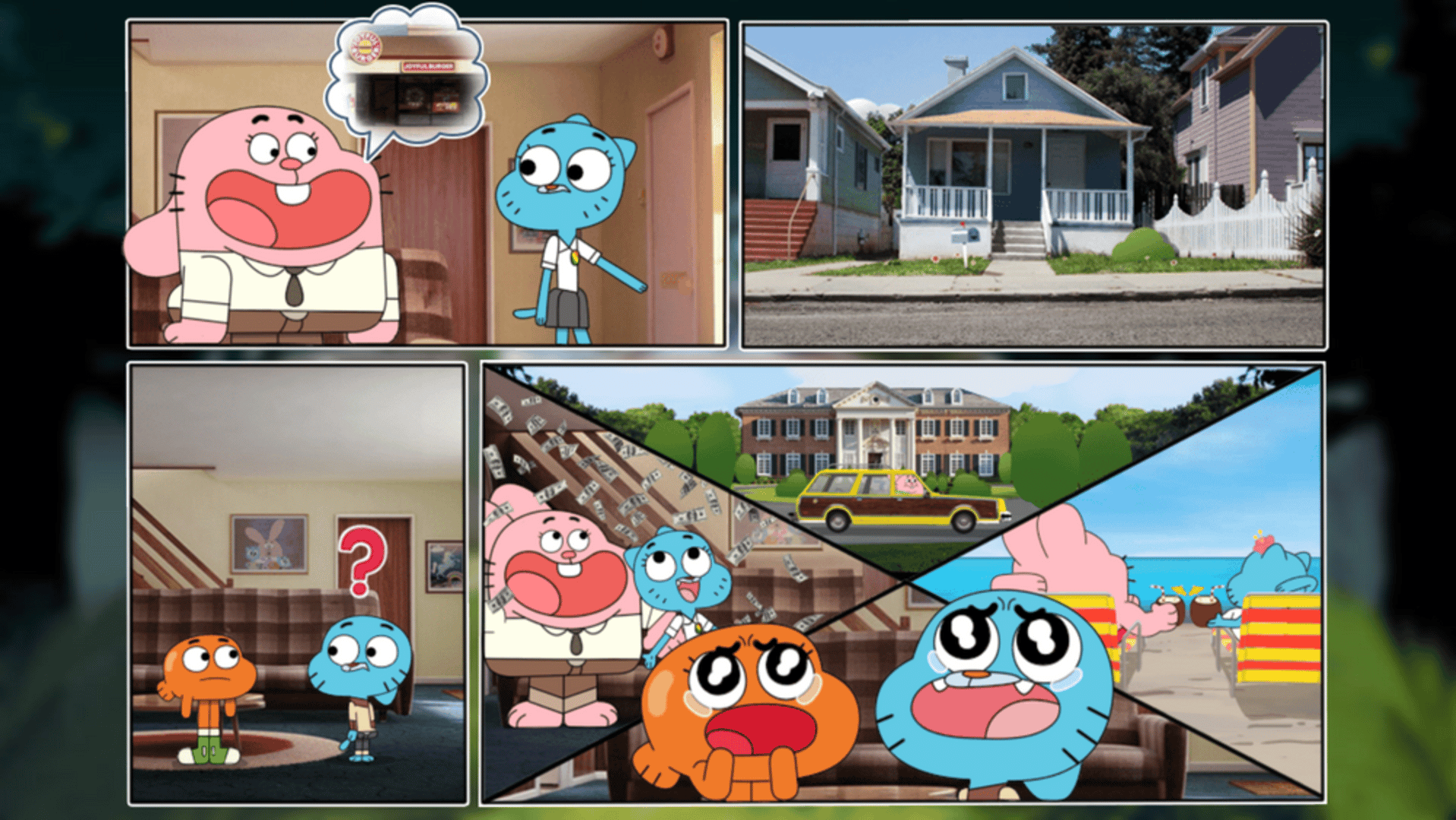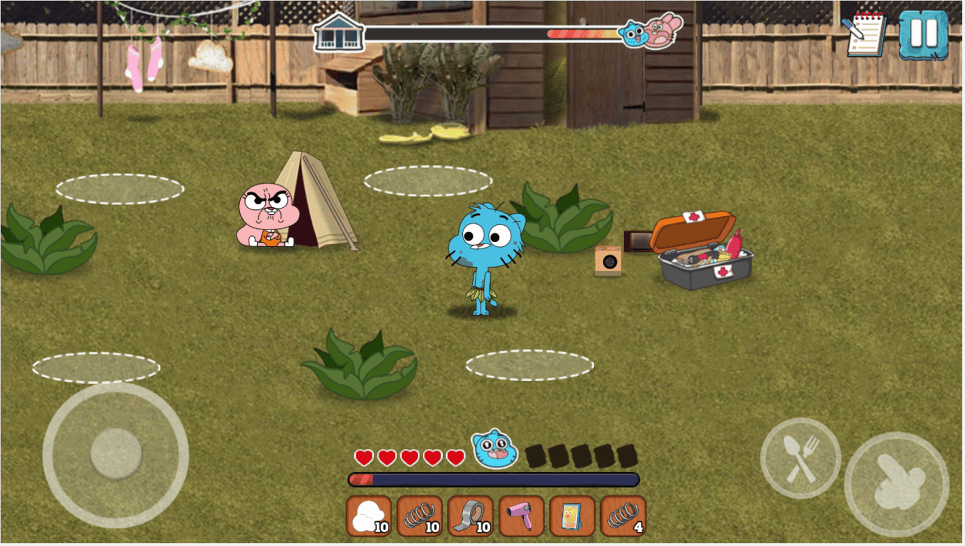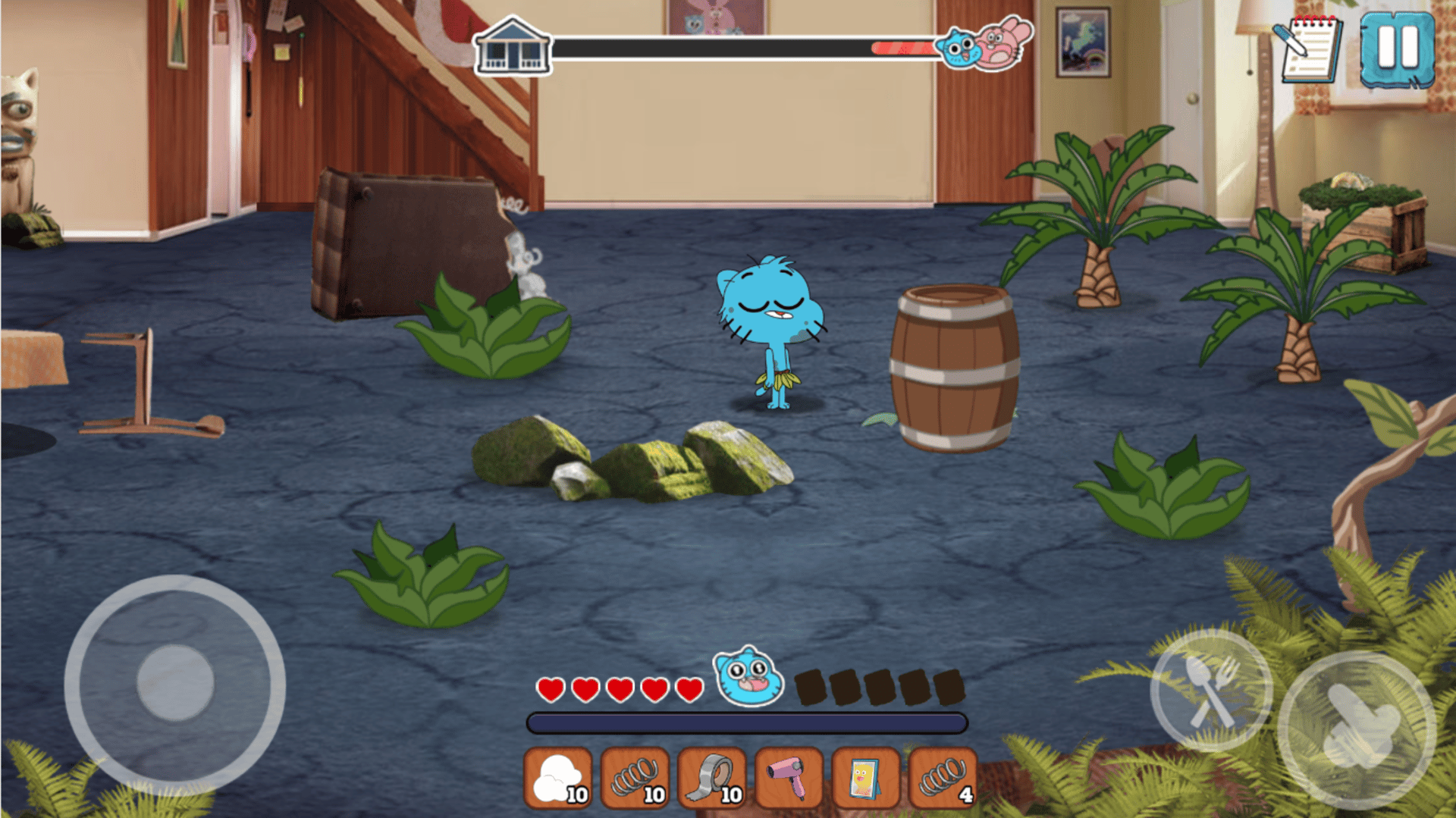 It seems that Gumball, Darwin, and Anais’s parents left out in the city for a while, and for them, it’s already the apocalypse, as they think they will be left alone and have to survive, which is the story of this game. Help Gumball and Darwin survive being home alone! Walk around with Gumball and rattle things to find items out of them, such as the bushes, the totem, the rug, and any other things around the house. Use said items to build a tent, a medicine room, an arcade game, a fire, and other necessary things! Make sure to take care of both your lives and your food rations, because if you were to lose them all, you also lose the game. The player controls Gumball attempting to survive while Nicole and Richard are out. At the bottom of the screen are Gumball's health (represented by hearts), hunger (represented by bags of chips) and his boredom meter. Gumball will lose health if he is attacked, and if he runs out he will die. Hunger drains over time and can be restored by eating food. Boredom also lowers over time and can be restored through various means of entertainment, such as breaking things. Gumball can use button to break objects and collect resources from them, such as bushes, totems, vases and other objects from around the house, and eat button to eat food from his inventory. Gumball only has 5 slots, which can carry up to 10 of a specific material each. If Gumball's inventory is full, he cannot pick anything else up. He can drop items by clicking on them. Gumball starts outside where he must build a camp to survive. Gumball gathers materials from inside and outside the house. Anais will also give Gumball materials, but provoking her will make her attack Gumball. Darwin is also a major hazard. Darwin will appear in random rooms and attempt to shoot Gumball with darts. If Gumball is hit, everything will go dark. Once Gumball wakes up, he finds most of supplies are gone and he has taken damage. The only way to avoid Darwin is to run away to another room.