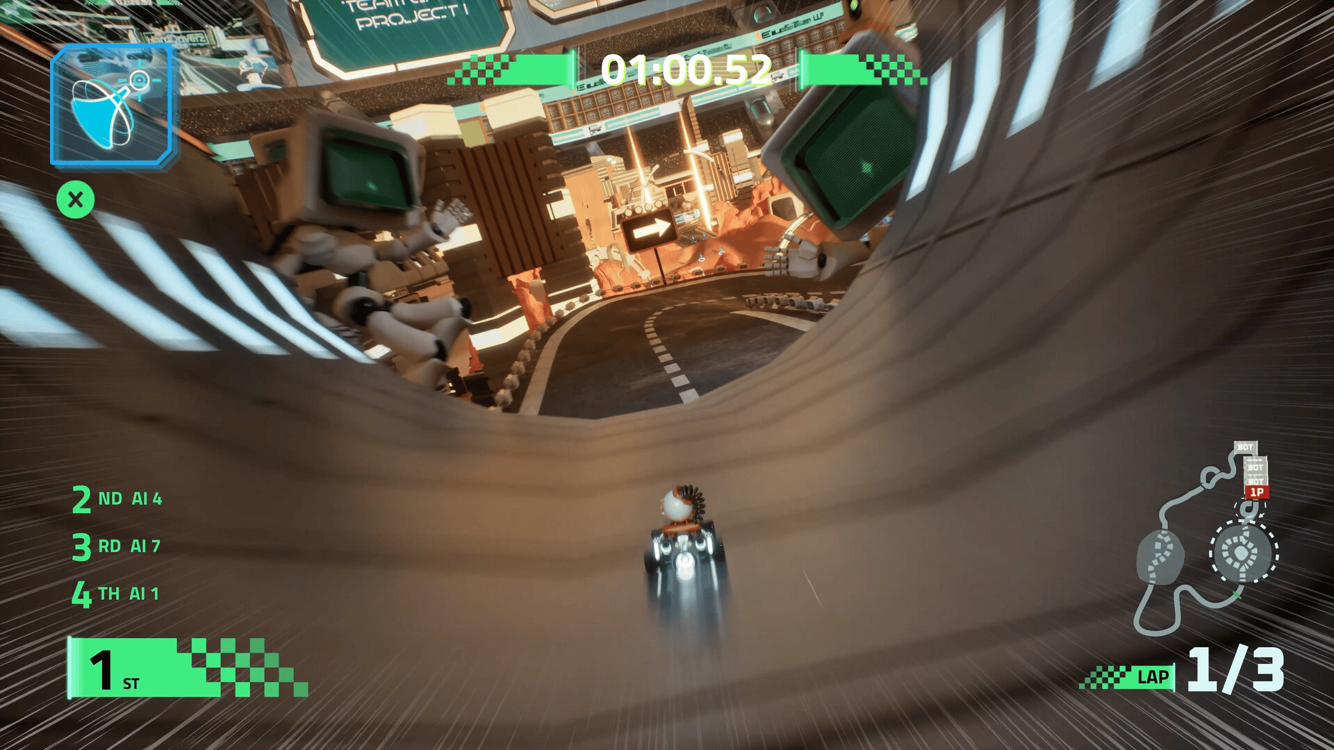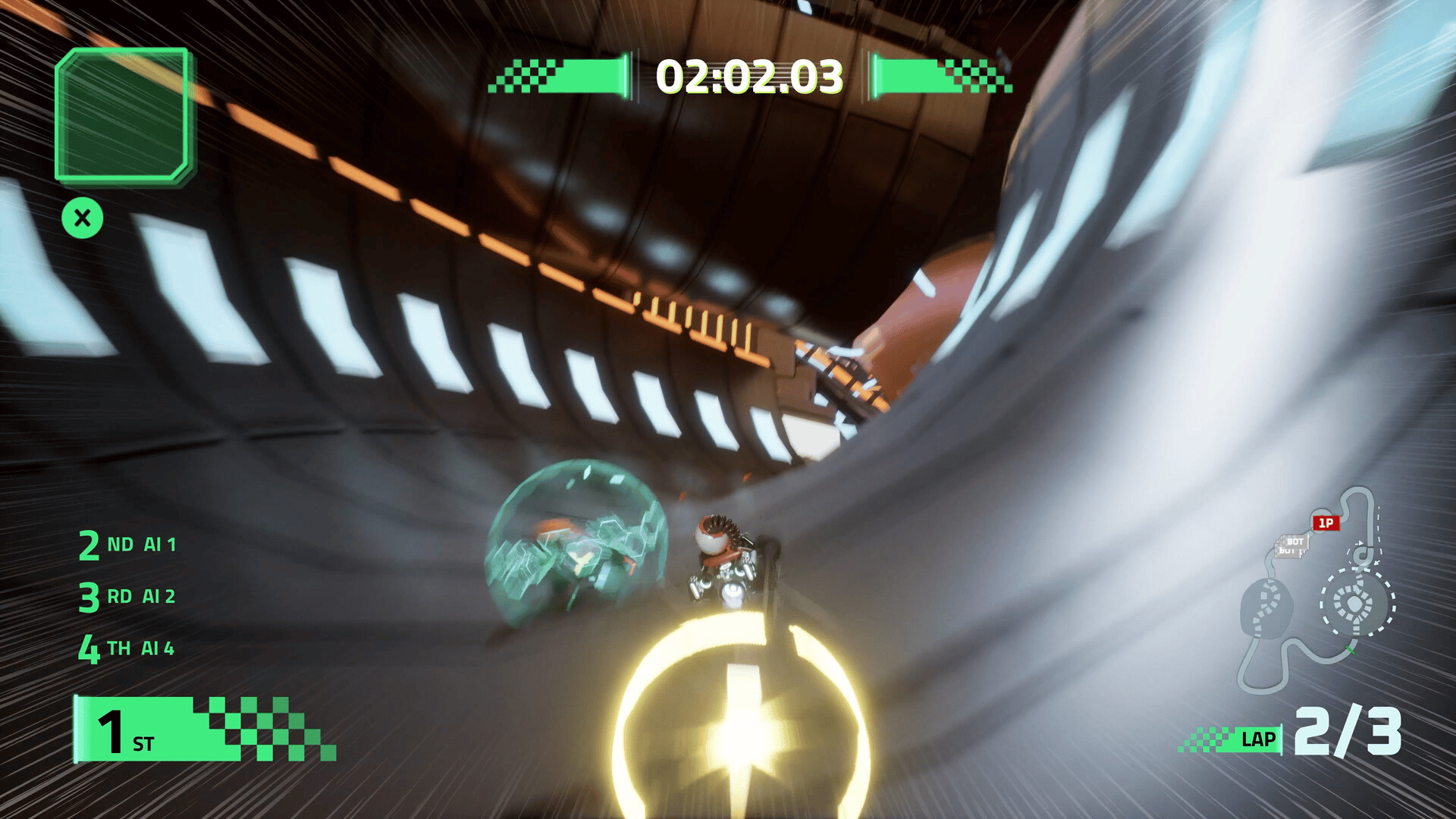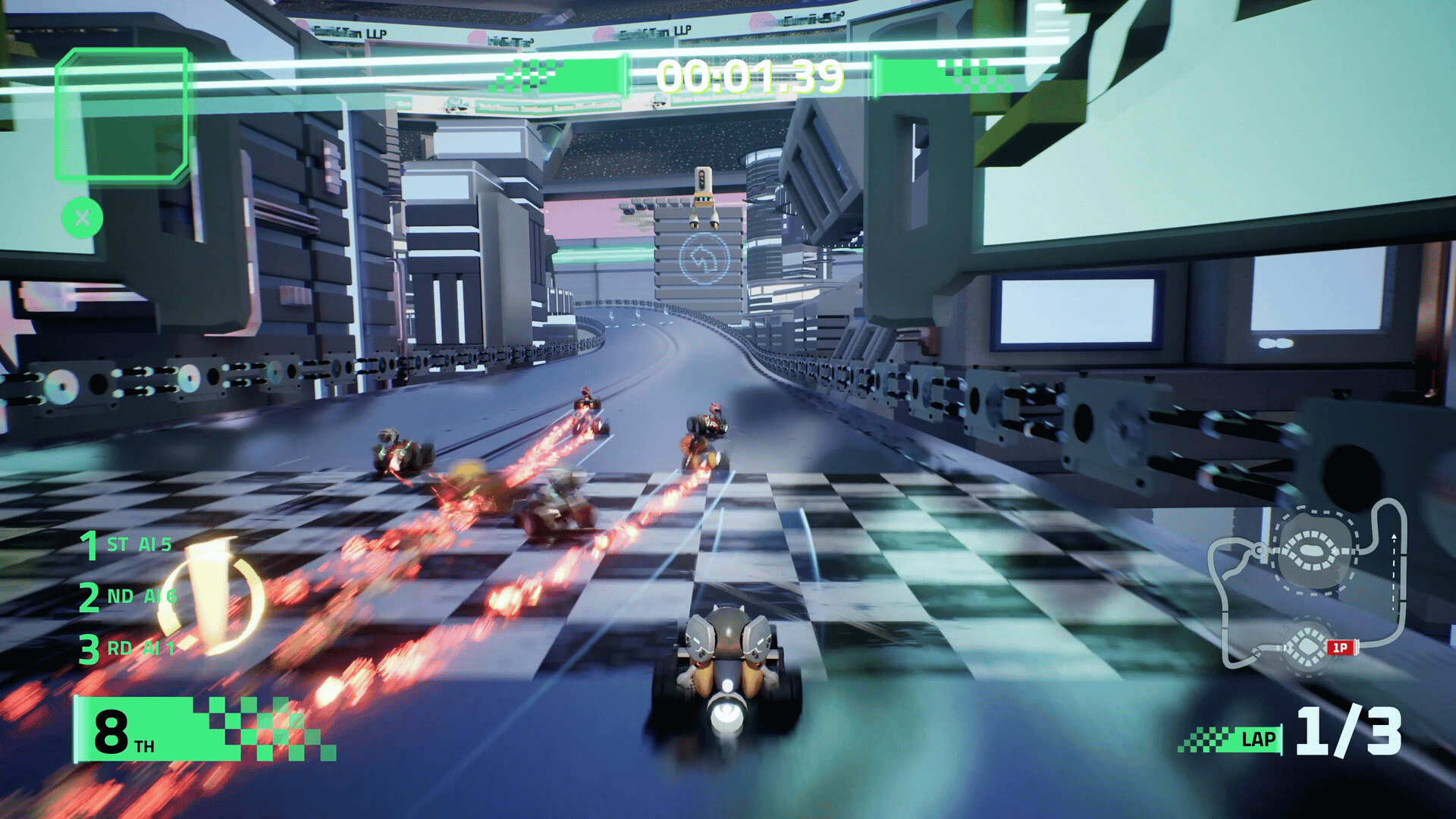 Burn rubber across futuristic cityscapes on twisting gravity defying tracks with customizable karts in this competitive arcade racer!