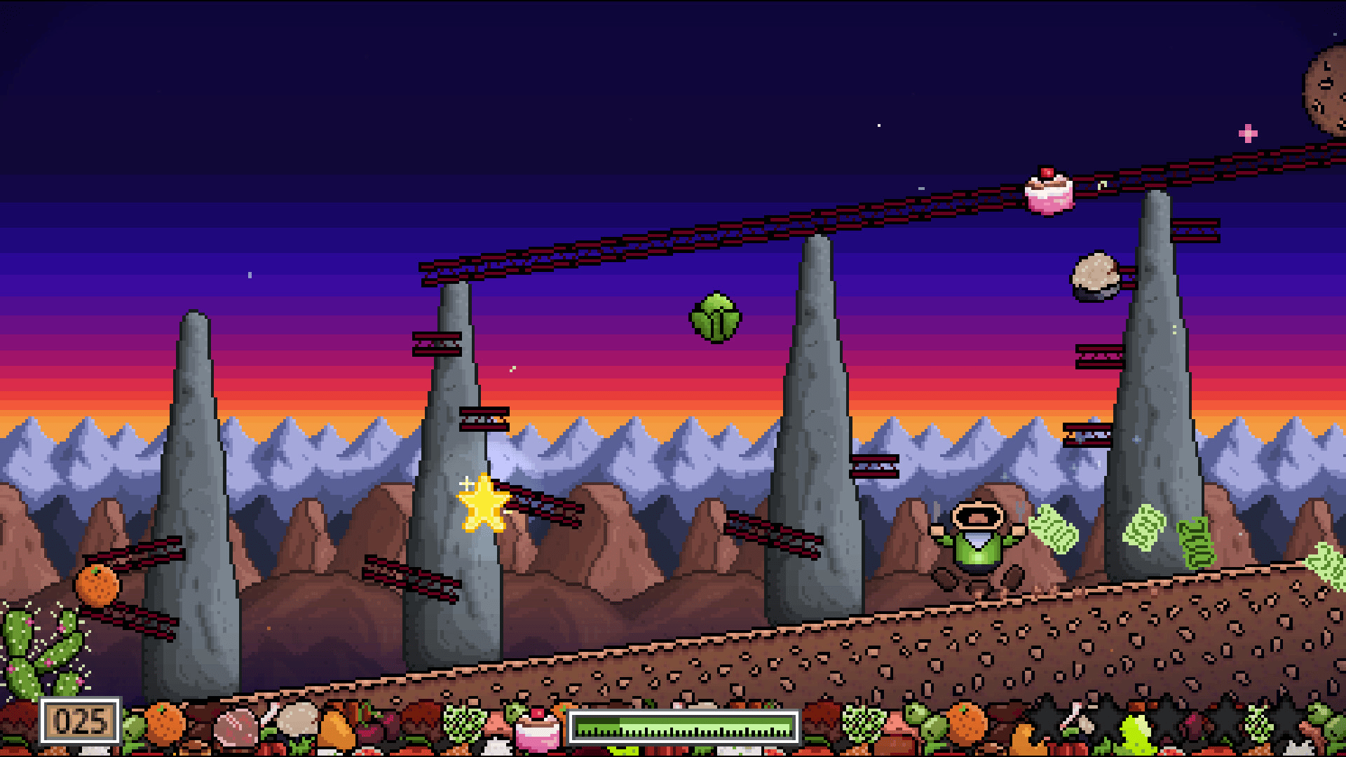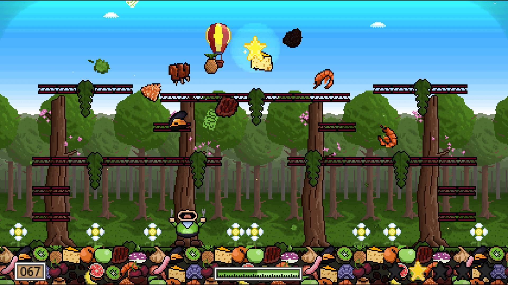 Food is your salvation and your downfall. Jump across platforms as you feast on the rain of food. Eat 100 to pass, and 150 to show off. Beware, too many or too few calories will kill you, and the rising tide, born of what you let fall, will swallow you whole.