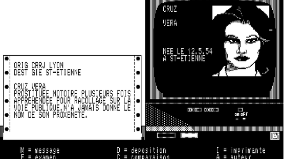 In your job as a detective sergeant in the crime squad, you are called upon to investigate what the press are fast terming "The Vera Cruz affair". Prostitute Vera Cruz lies sprawled on the floor. The more observent among you will have noticed the pool of blood that has poured from a bullet wound in her chest. It is believed to be a case of suicide but you have to prove that this was murder. If you can bear to go past the beautiful girl, you are returned to HQ where the telex machine is used to gain information about possible suspects. Vera Cruz is a very faithful reconstruction of how a real murder investigation would be carried out. Let's enter the sordid underworld of detectives, pimps and prostitutes.