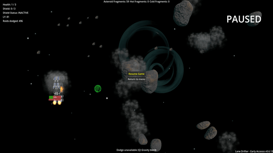 A sci-fi arcade dodger where you pilot a ship through asteroid fields using precision, gravity bombs, and mining tools. With no weapons, survive by drifting, dodging, and scoring based on distance and hazards avoided. What else might be lurking in this galaxy?