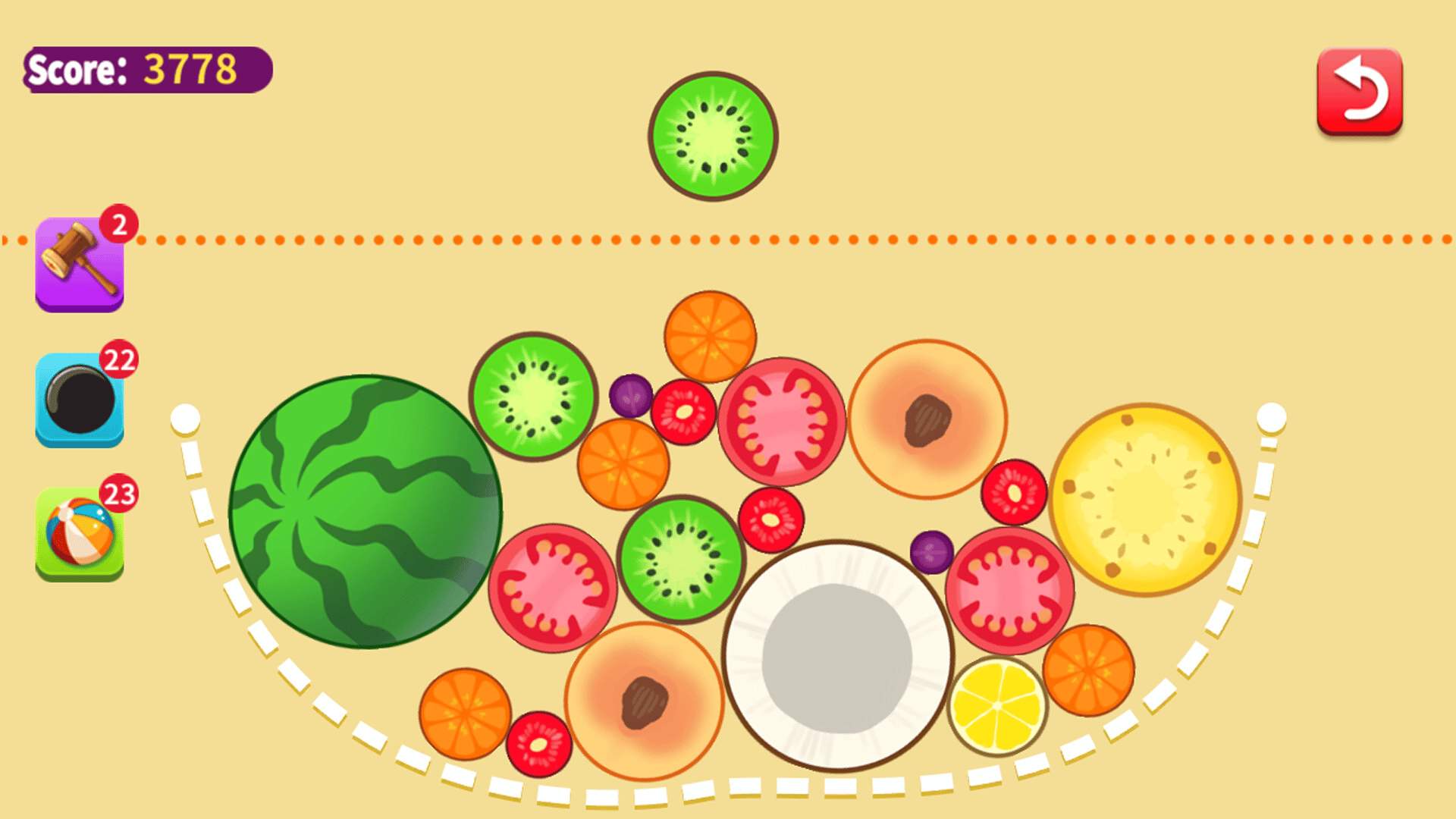 The game is based on the theme of watermelon. You only need to collide the same fruits to synthesize. Three special props: Hammer: One click, you can crush any kind of fruit; Bomb: You can eliminate two adjacent fruits at the same time; Color ball: can eliminate all fruits of the same color.