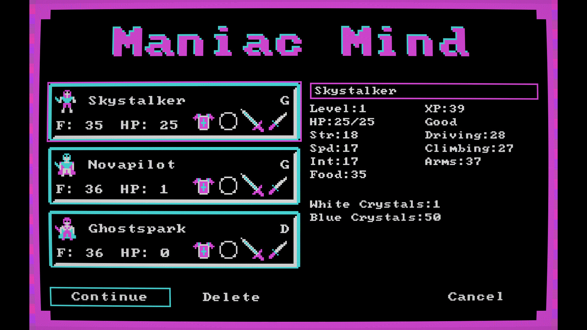 A psychotic AI rules the land. Explore towns, brave dungeons, and travel to distant worlds in this authentic late-80s style CRPG. Uncover clues, gather strength, and find a way to end the Maniac Mind’s reign.