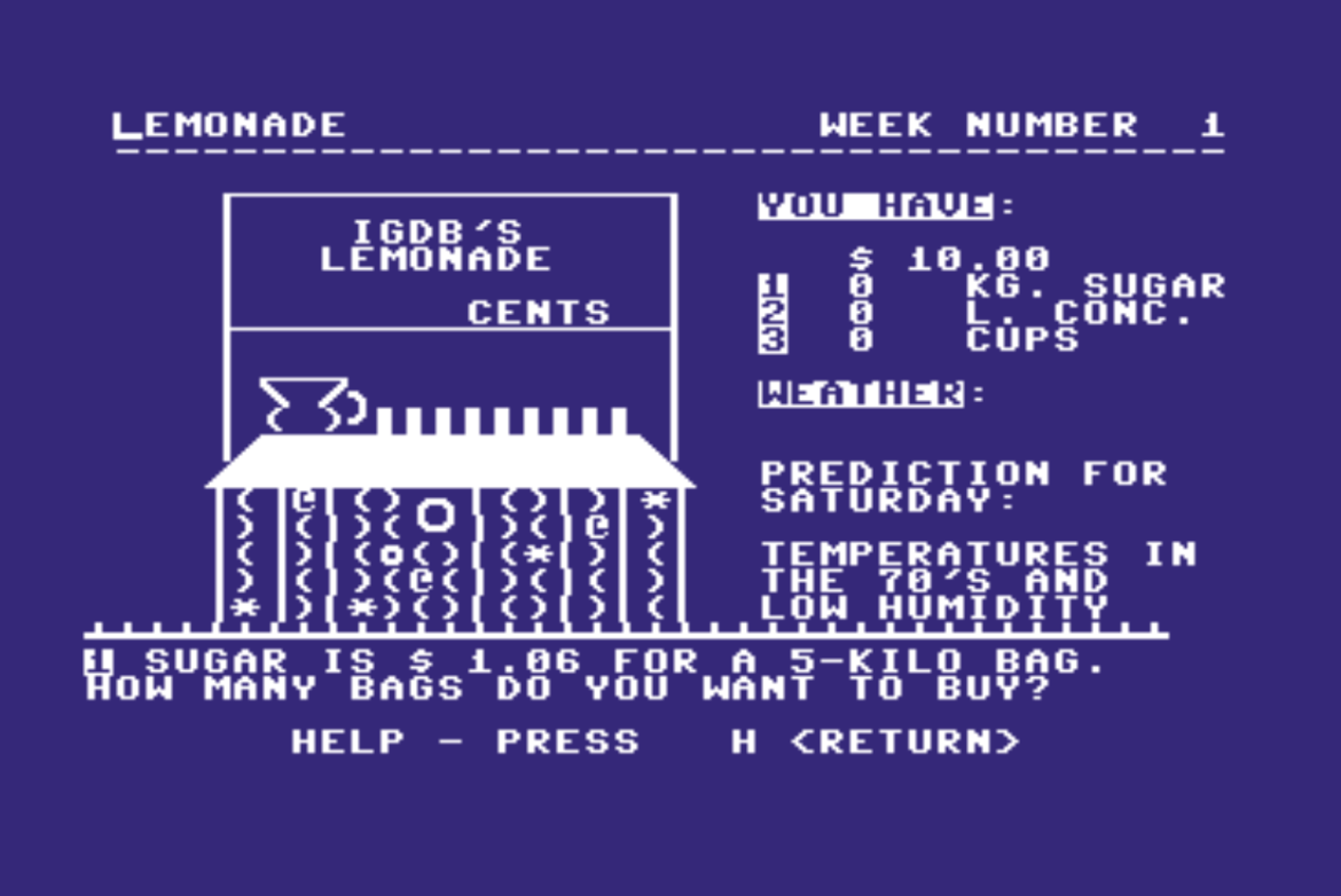 The classic "Lemonade Stand" game brought to the C64, with instructions for students. Run a lemonade stand for 10 saturdays in summer. Try to make as big a profit as you can while managing costs and reading weather conditions.