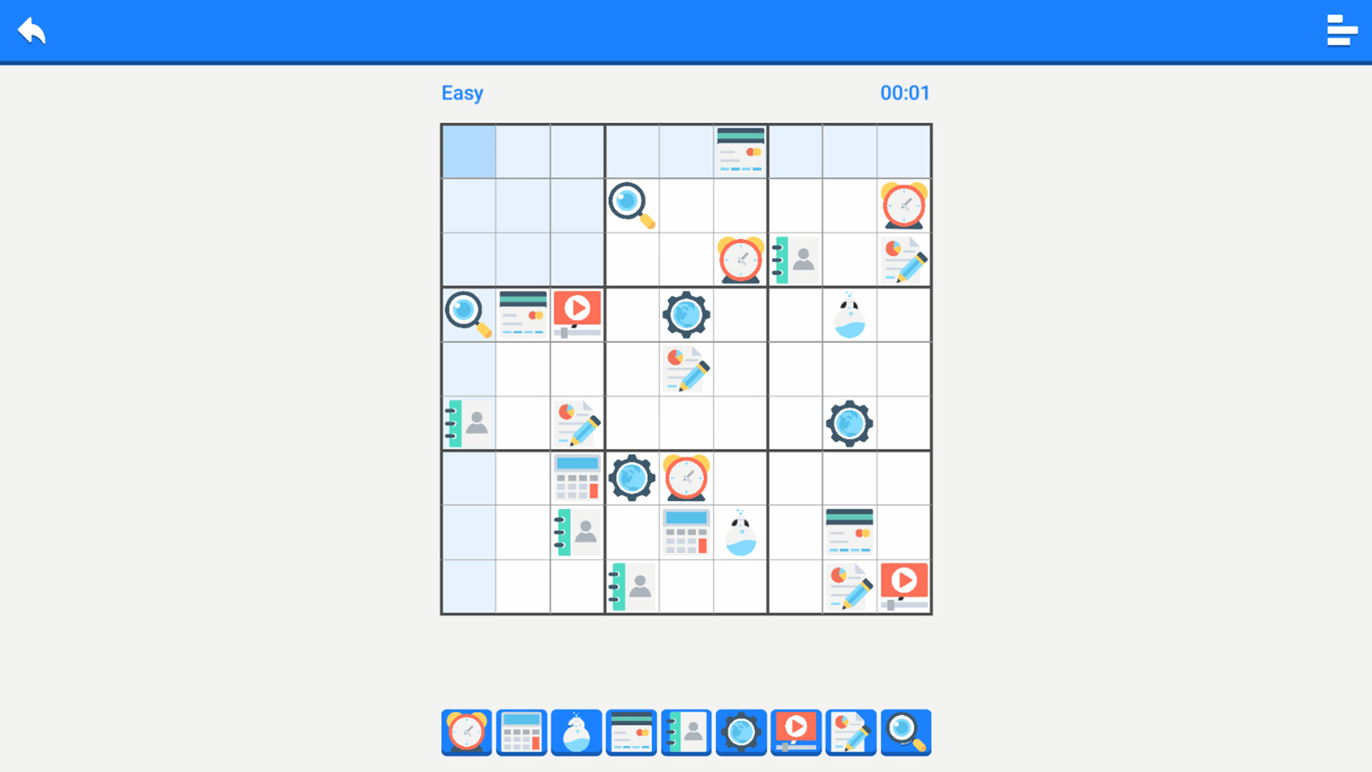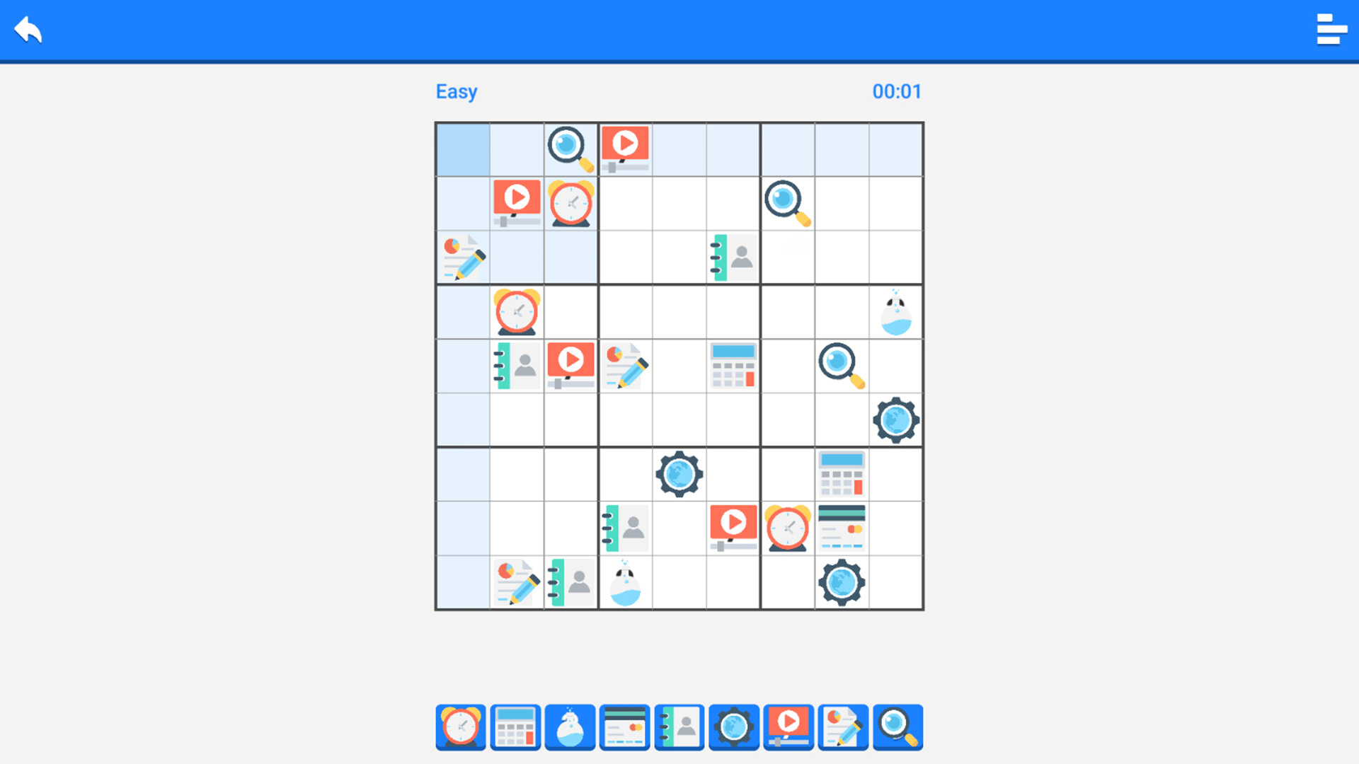 This is a variant of a very classic Sudoku game. Within a 9X9 grid, 9 different icons are placed, ensuring that each row, each column, and each section contains 9 different icons. It is extremely challenging.