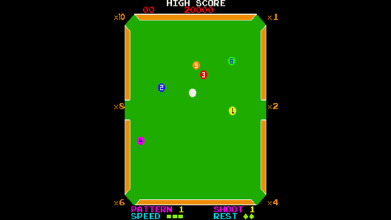 "VIDEO HUSTLER" is a sports game released by KONAMI in 1981. This game is a simplified version of pool (pocket billiards). You strike the white cue ball to roll it, hit six balls, and sink them into the pockets.