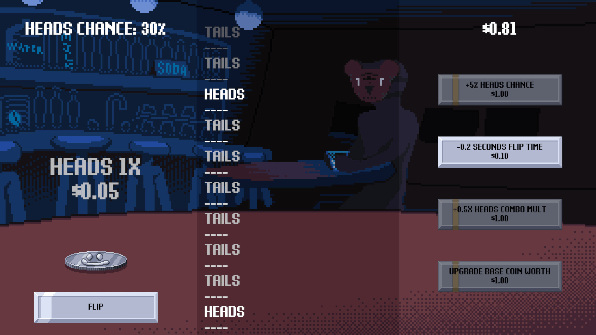 A non-idle clicker game about flipping a coin that hates you. Starting with just a 20% chance of getting heads, can you get ten heads in a row?