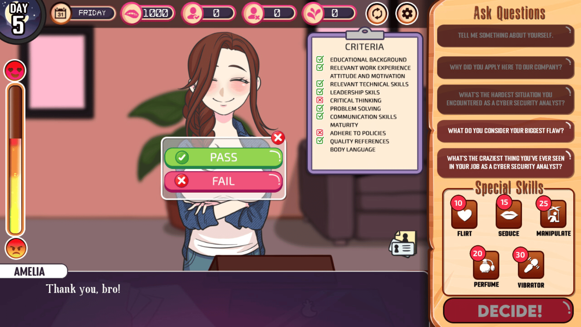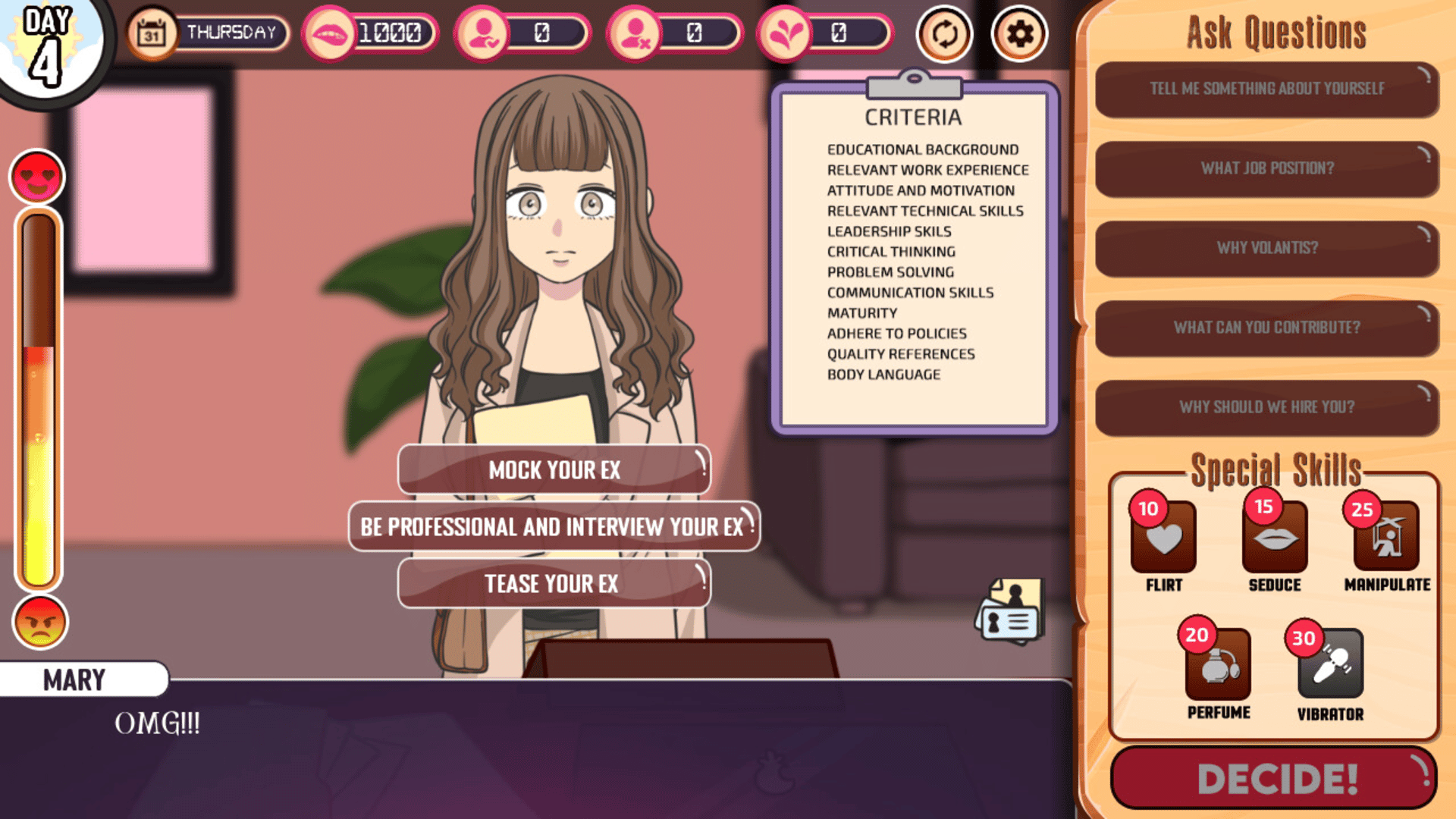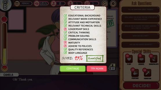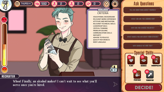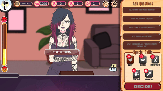 Become a Horny Recruiter of a multi-national recruitment company and interview different unique applicants. As you get to know them professionally, intimately, romantically, and sexually, will you be able to do your job well enough and resist the temptation?