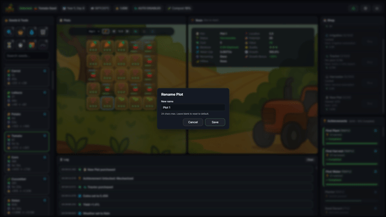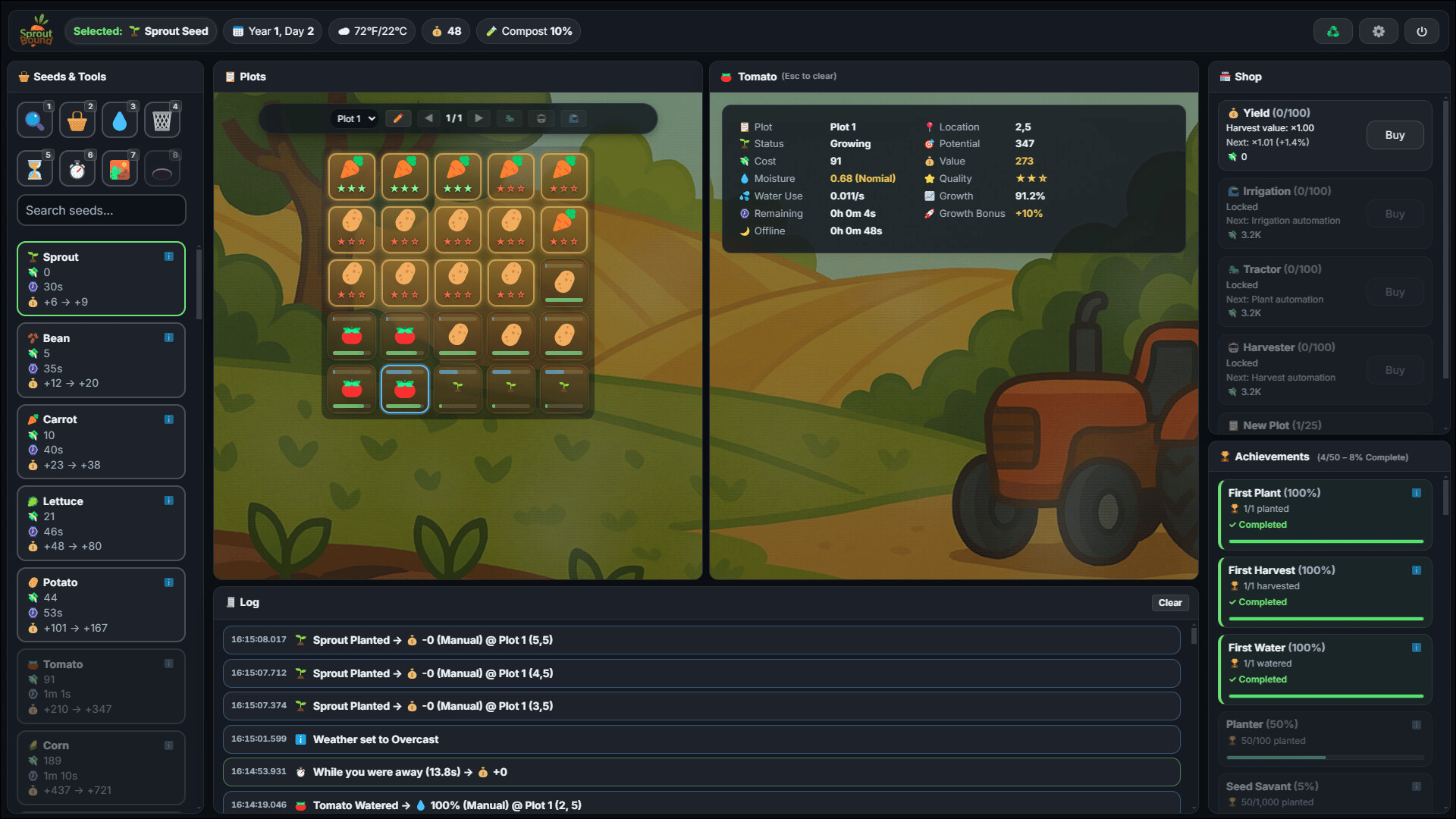A cozy incremental farming sim from a solo developer where you plant, water, and harvest crops to grow your garden—even while you’re away. Unlock upgrades like the tractor, harvester, and irrigation system to automate progress, boost yields, and turn your garden into a thriving, hands-free farm.