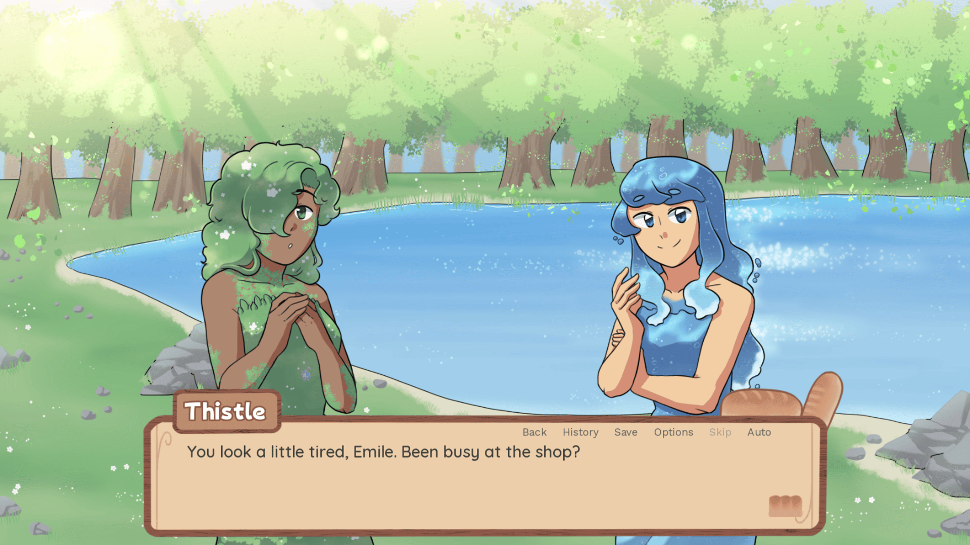 Bread Makes the Heart Aflutter is a romantic, slice-of-life, fantasy visual novel. It follows Emile Mayer, owner of A Slice of Comfort bakery in the Kingdom of Selias, when the Fae Kingdom's royal procession brings an interesting newcomer into his life.