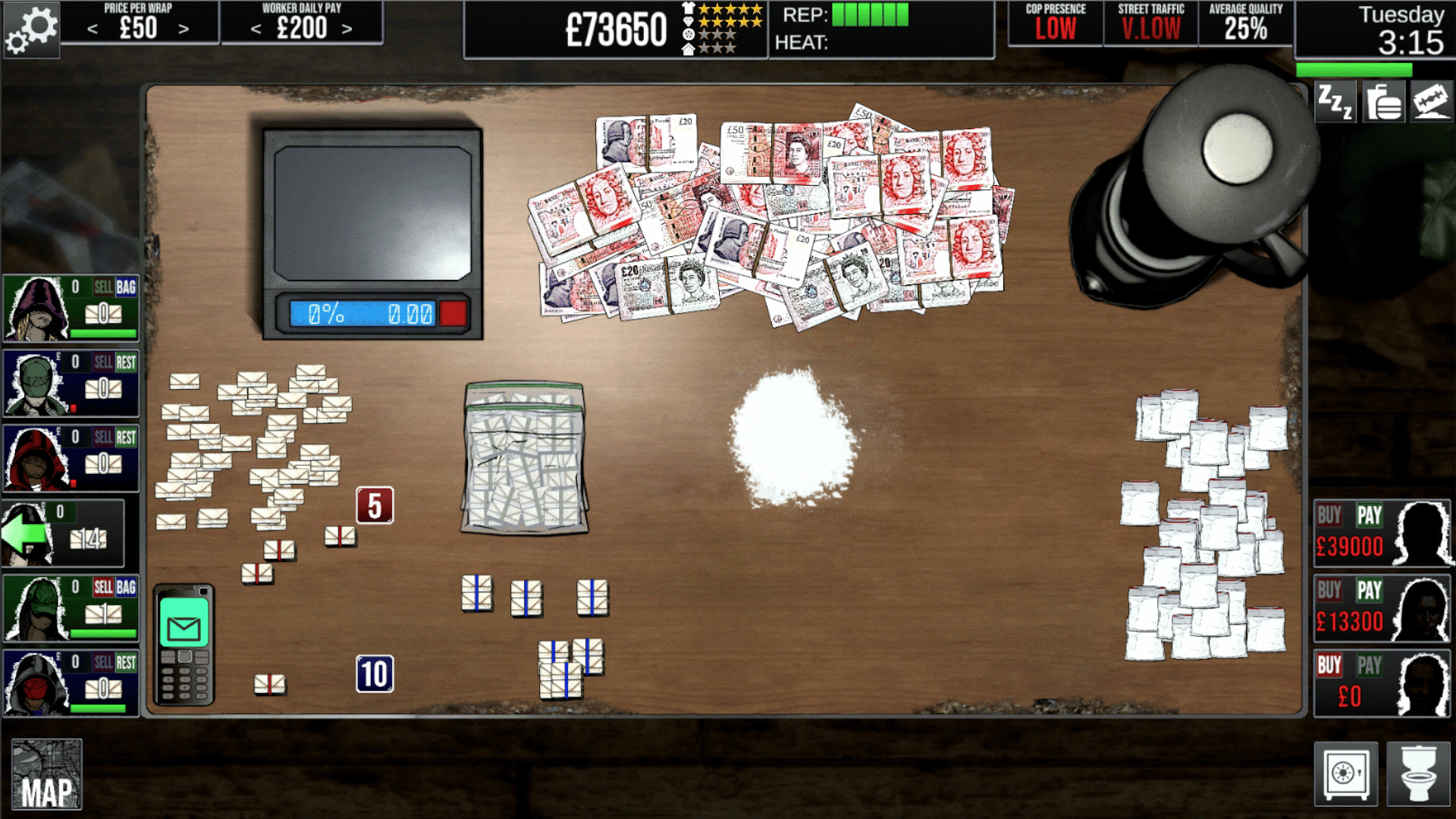 A clicker/management drug dealing simulator. Get your product cut and wrapped quickly and out on the streets. Build your crew, expand your operation, and climb the supply chain. Stay ahead of the cops, keep your crew in line, or pay the price.