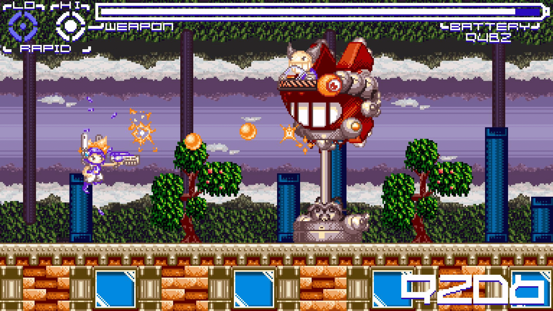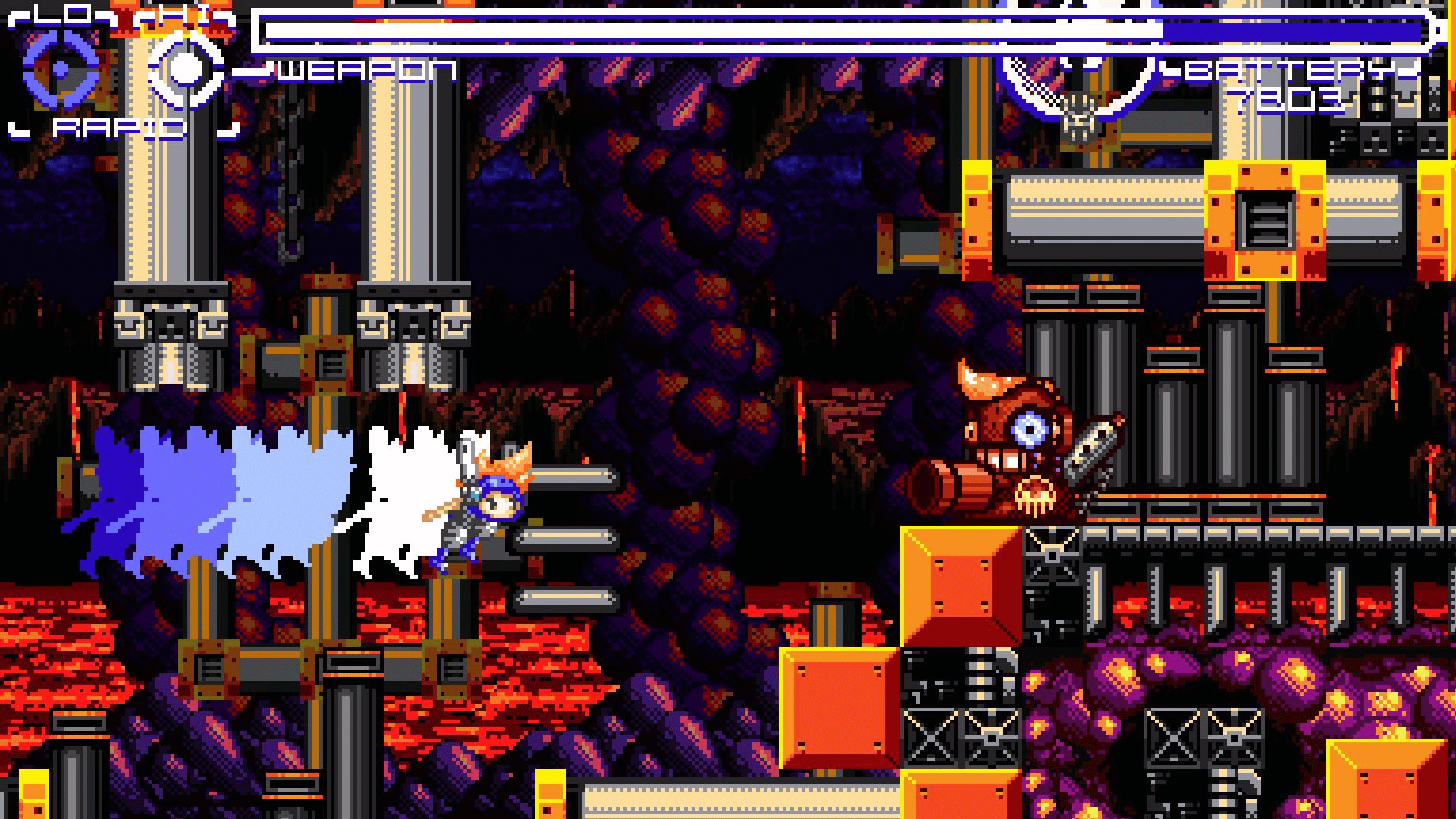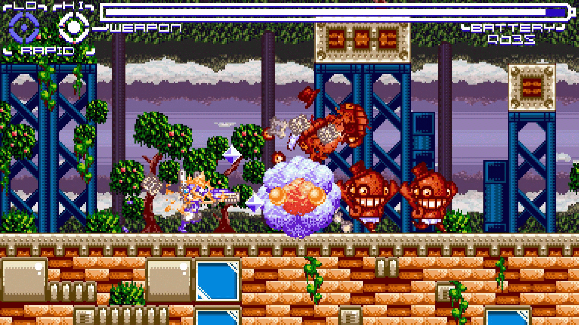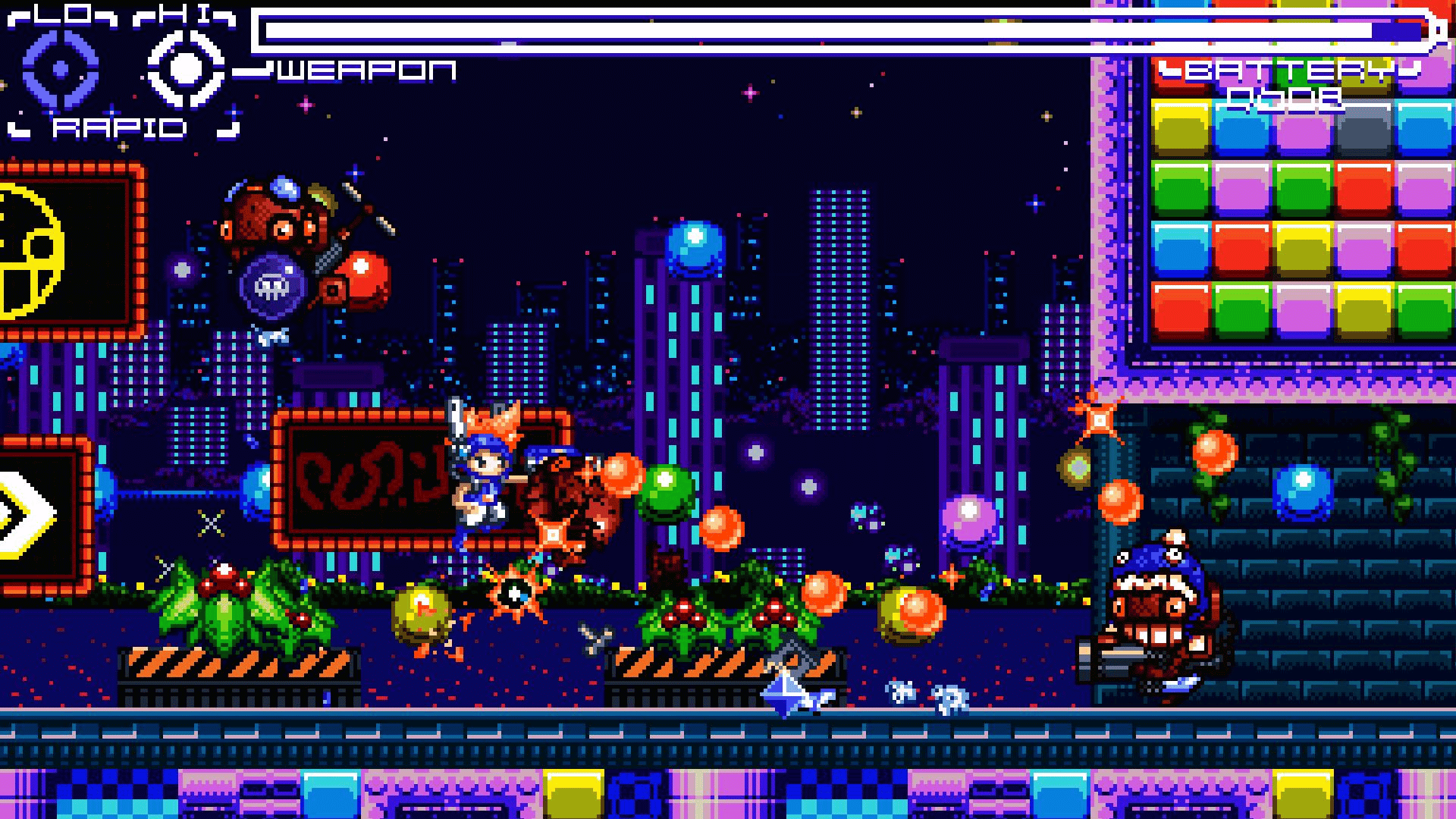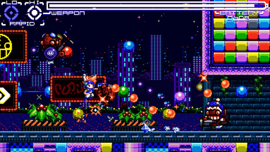 Blast through three stages defeating enemies and bosses as you go. Be careful though as your battery meter continually keeps losing power. You can toggle through two power modes, (low and high) to help crush the enemy. Collect pick ups, avoid traps and blast your way through victory!