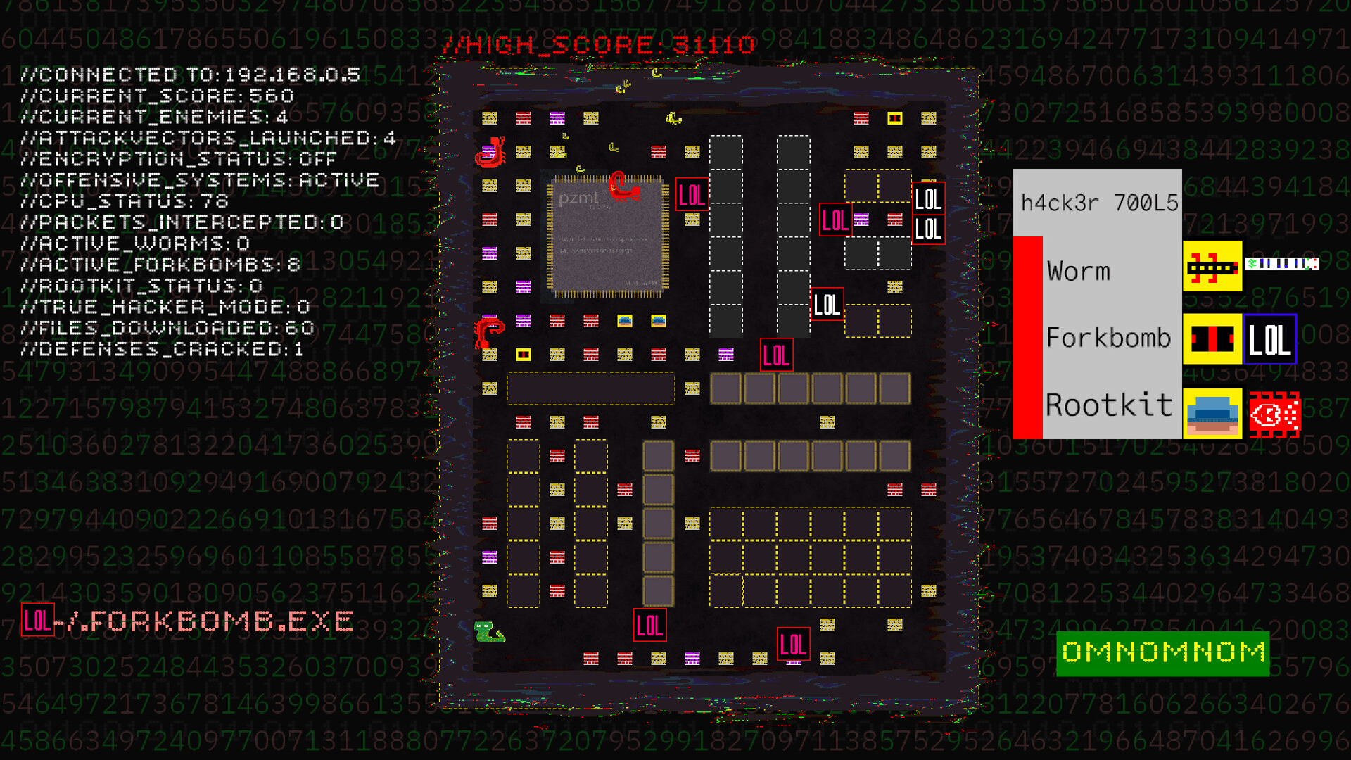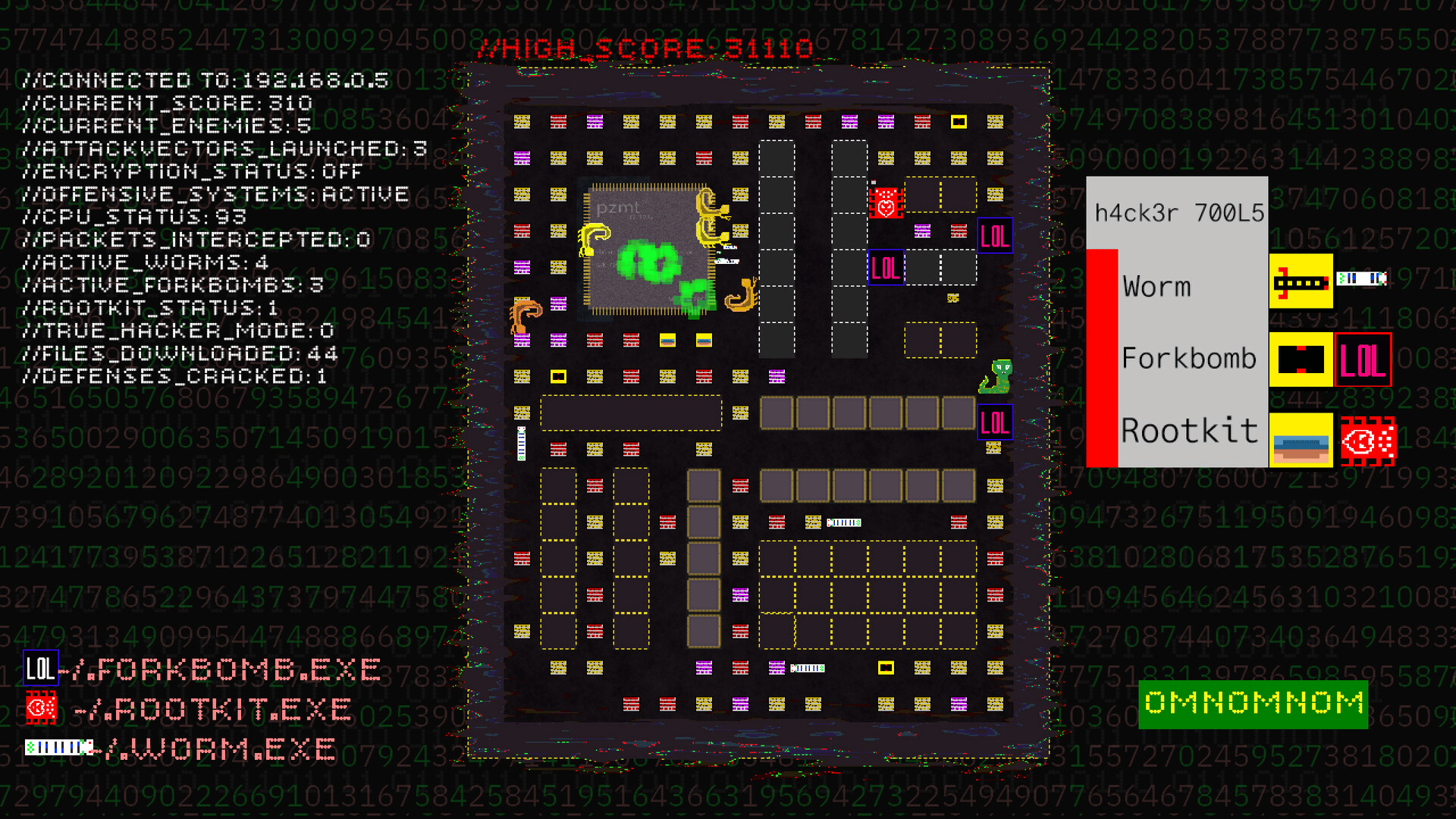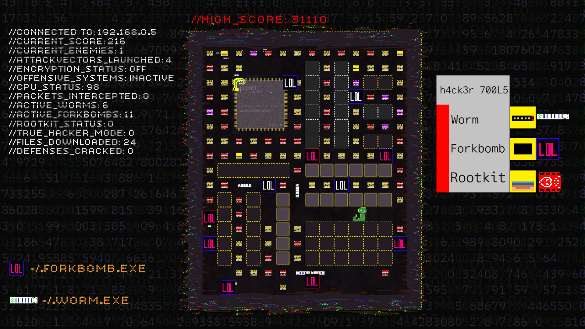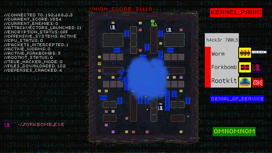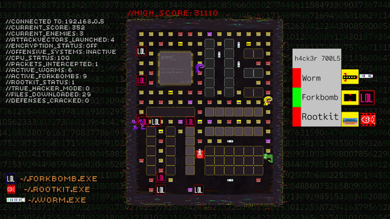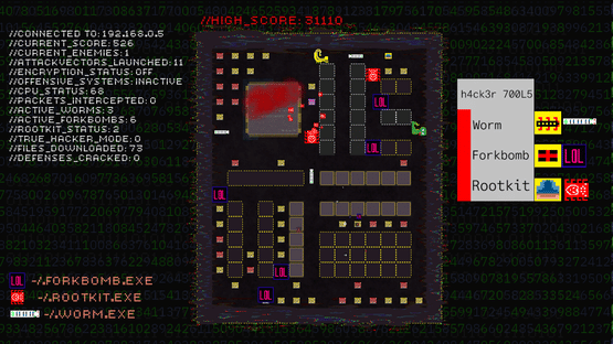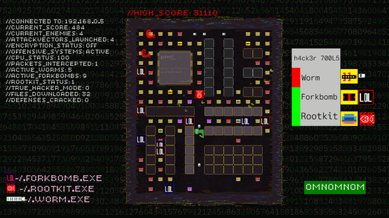 A fast paced arcade maze chasing game inspired by the 90s media portrayal of hackers and their culture. Download files, evade enemies, collect power-ups, launch rootkits, worms, and forkbombs and unleash total chaos.
