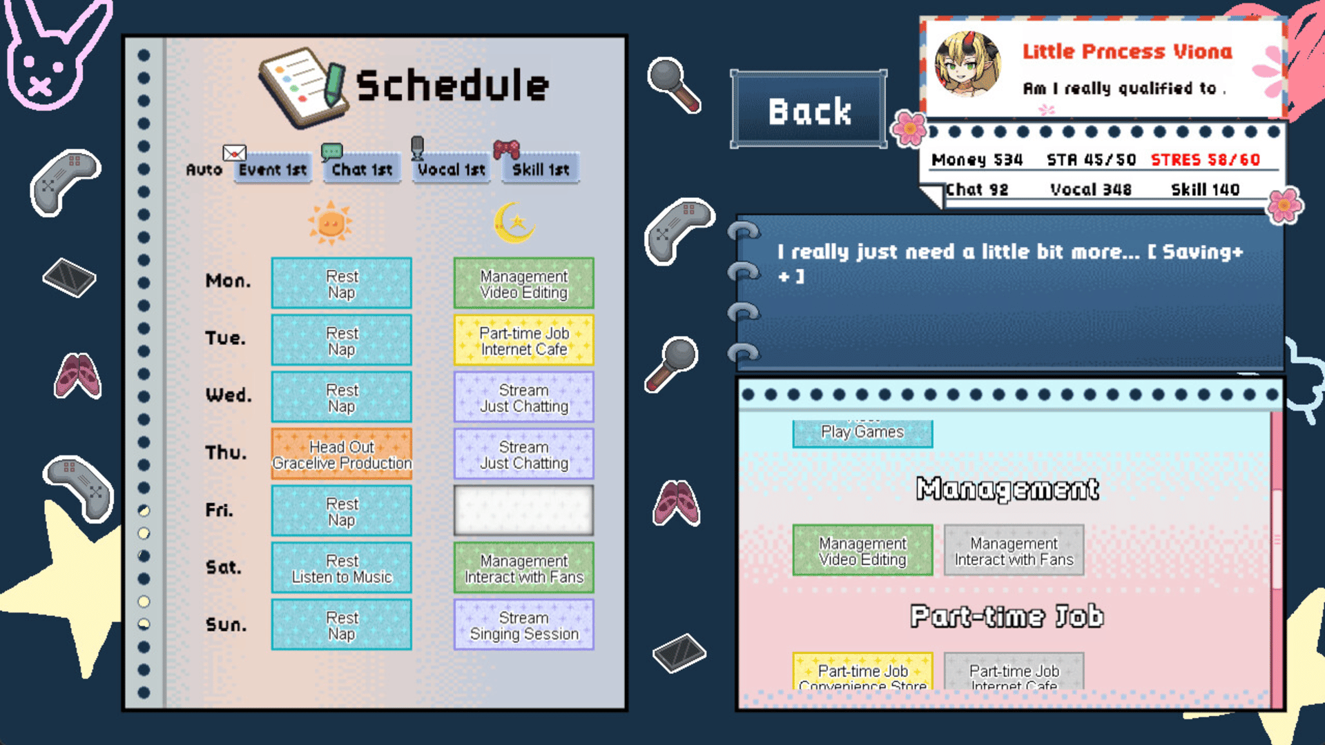 RE0: VTuber Life is a VTuber simulation game where you manage the protagonist’s daily life, livestream schedule, friendships, gossip intake, and fan interactions—all leading to multiple possible endings.
