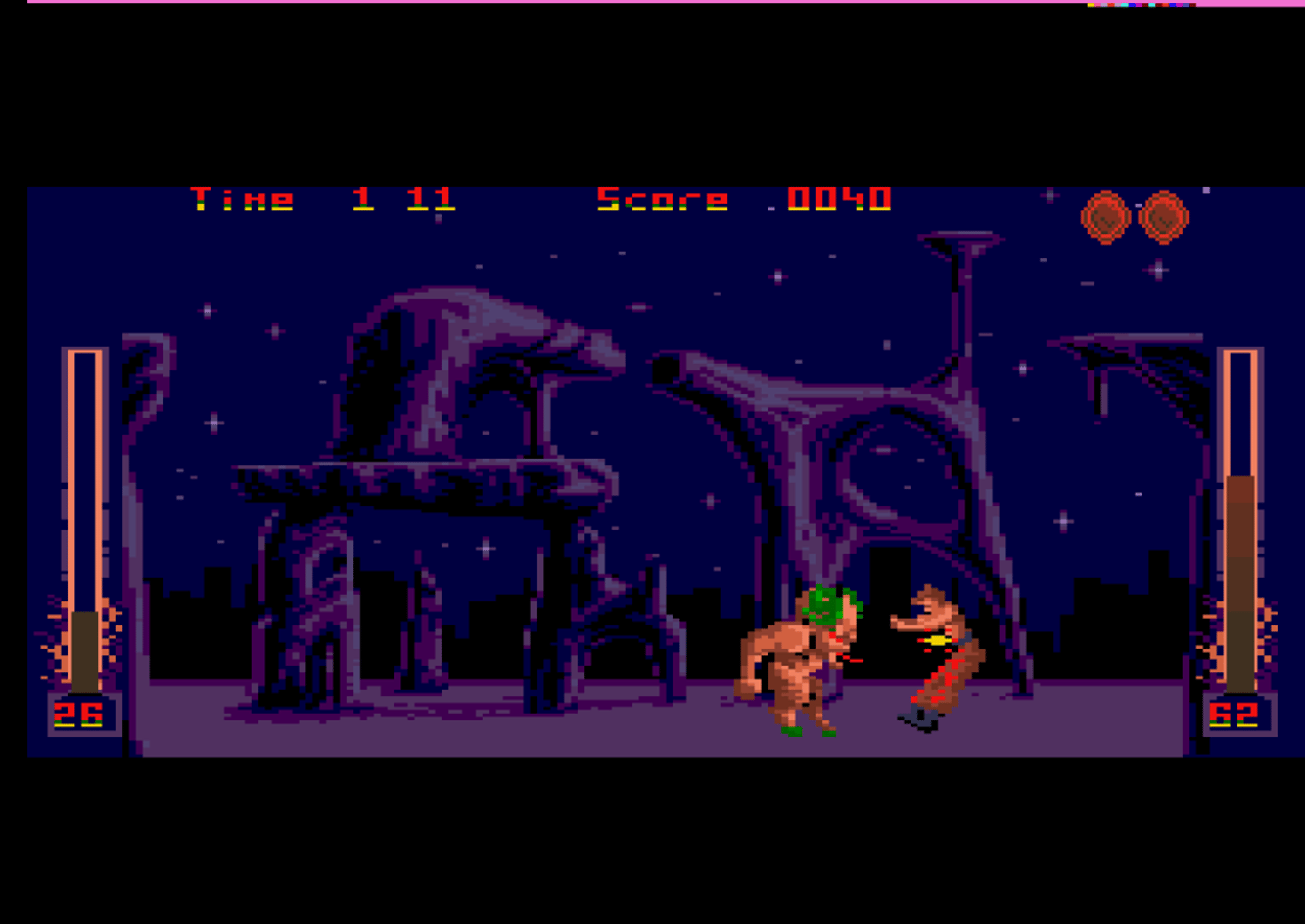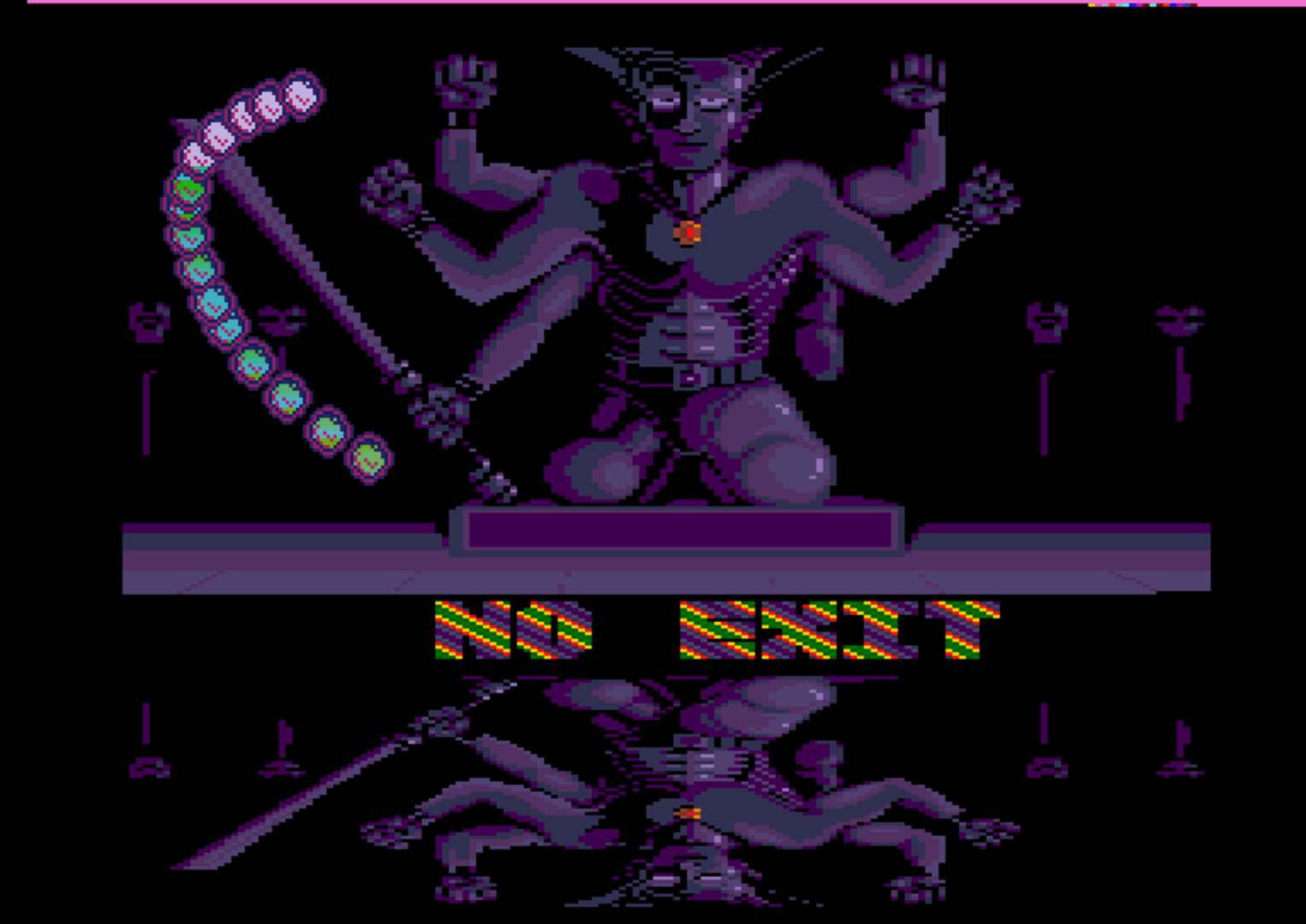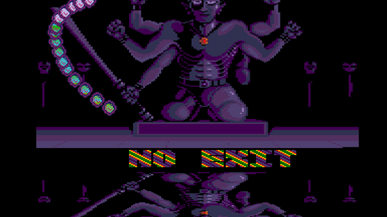 No Exit is a side-view martial arts beat 'em up, similar in style to IK+. Each fight must be won within a time limit. You can specify your character's ability quite precisely, trading off Vivacity against Efficiency and Resistance against Strength. Your character has a special destructive mode, which can be accessed 3 times. This turns the character into a monster (corresponding to the opponent you are fighting against) and increases the level of damage you can inflict.
