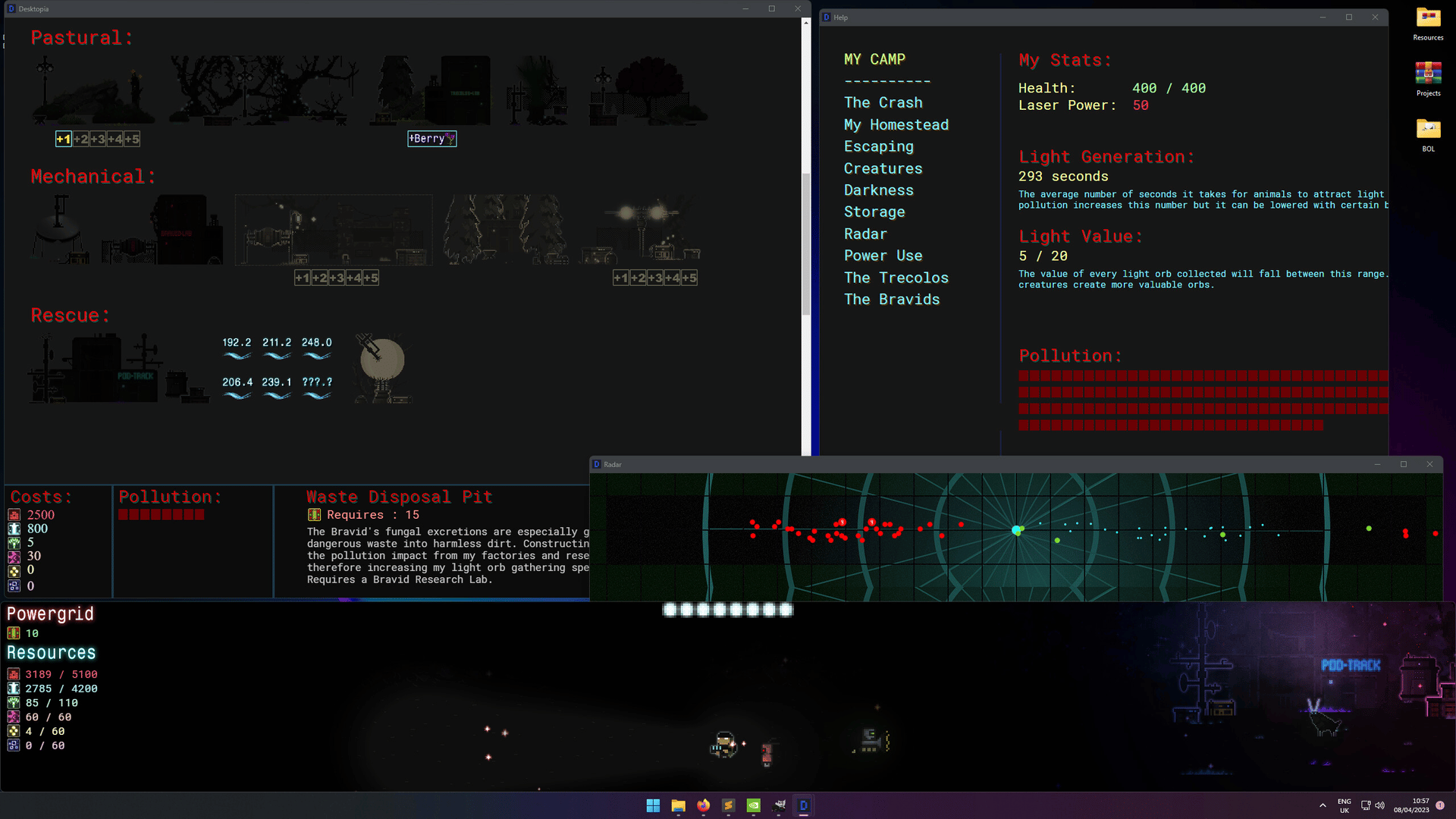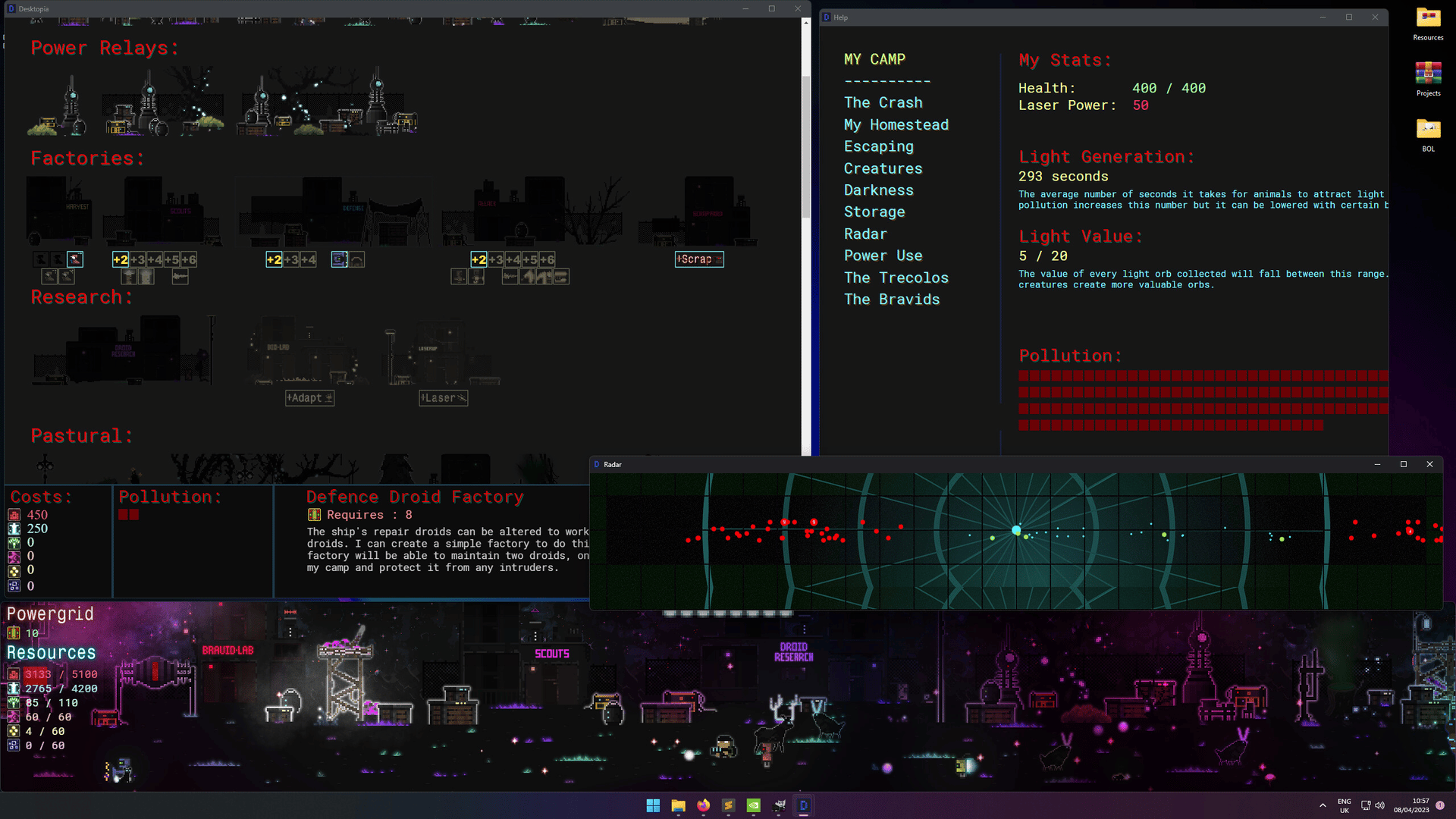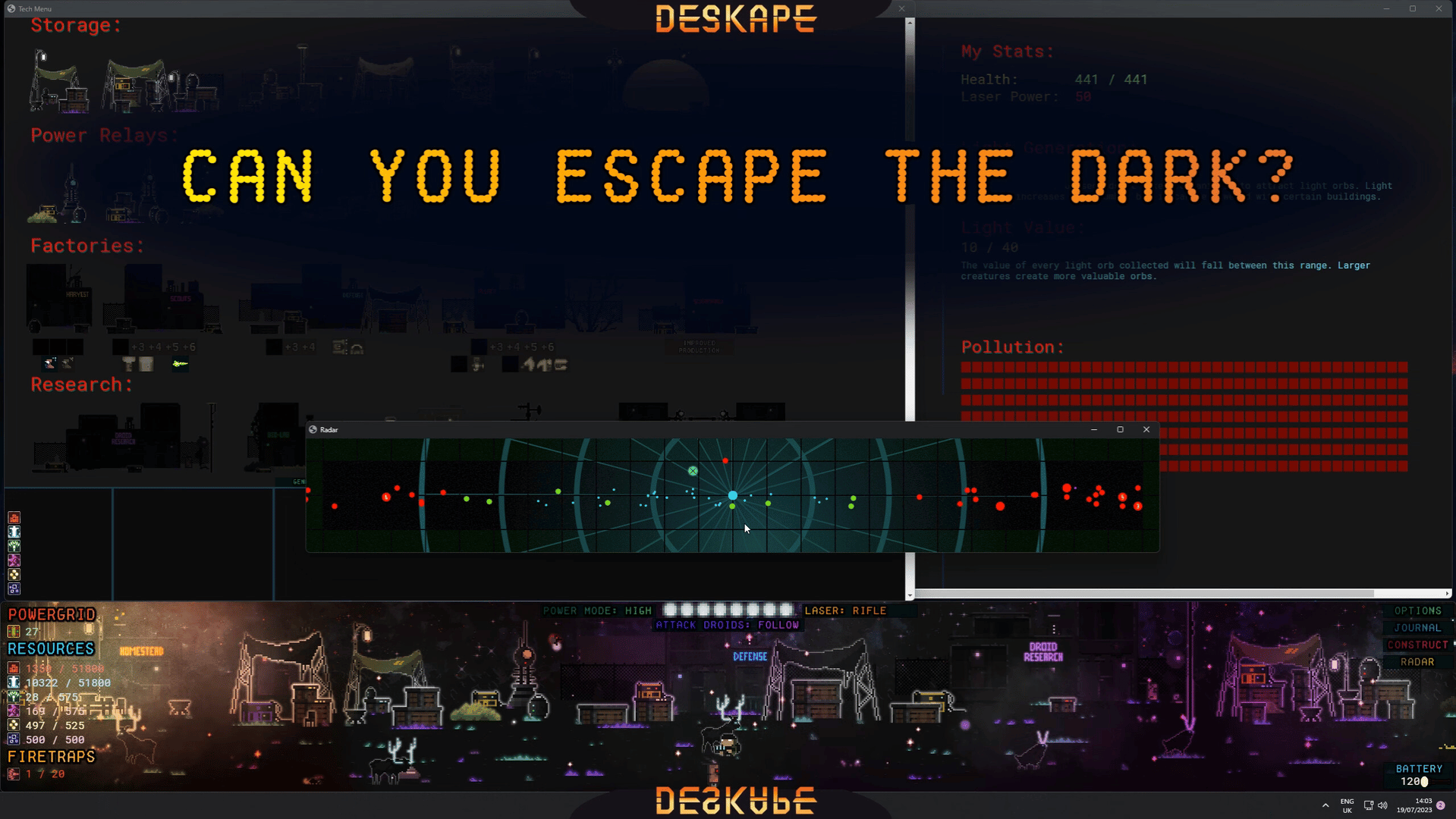 'dEskape' is a base-building game which sits across the bottom of your desktop allowing you to work, browse, or watch something else while you play. It's idle when you like and active when you want.