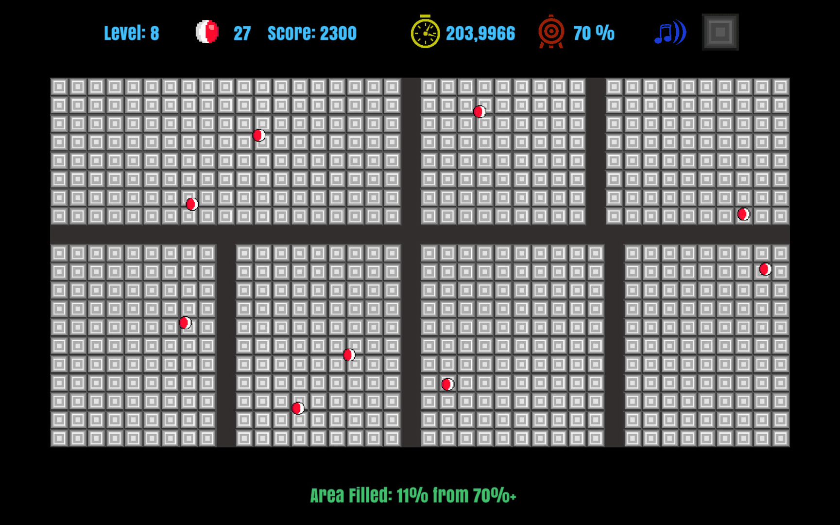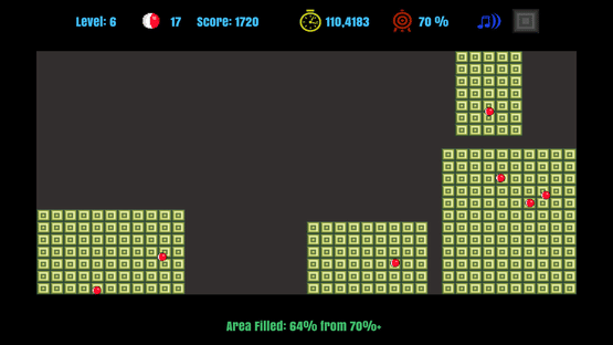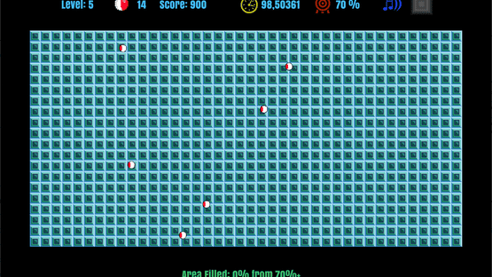 In JezzBall, your goal is to contain bouncing Jezz atoms by building walls. Complete levels by converting over 75% of the chamber into walls, adding a new atom each time. Left-click to deploy walls and right-click for direction.