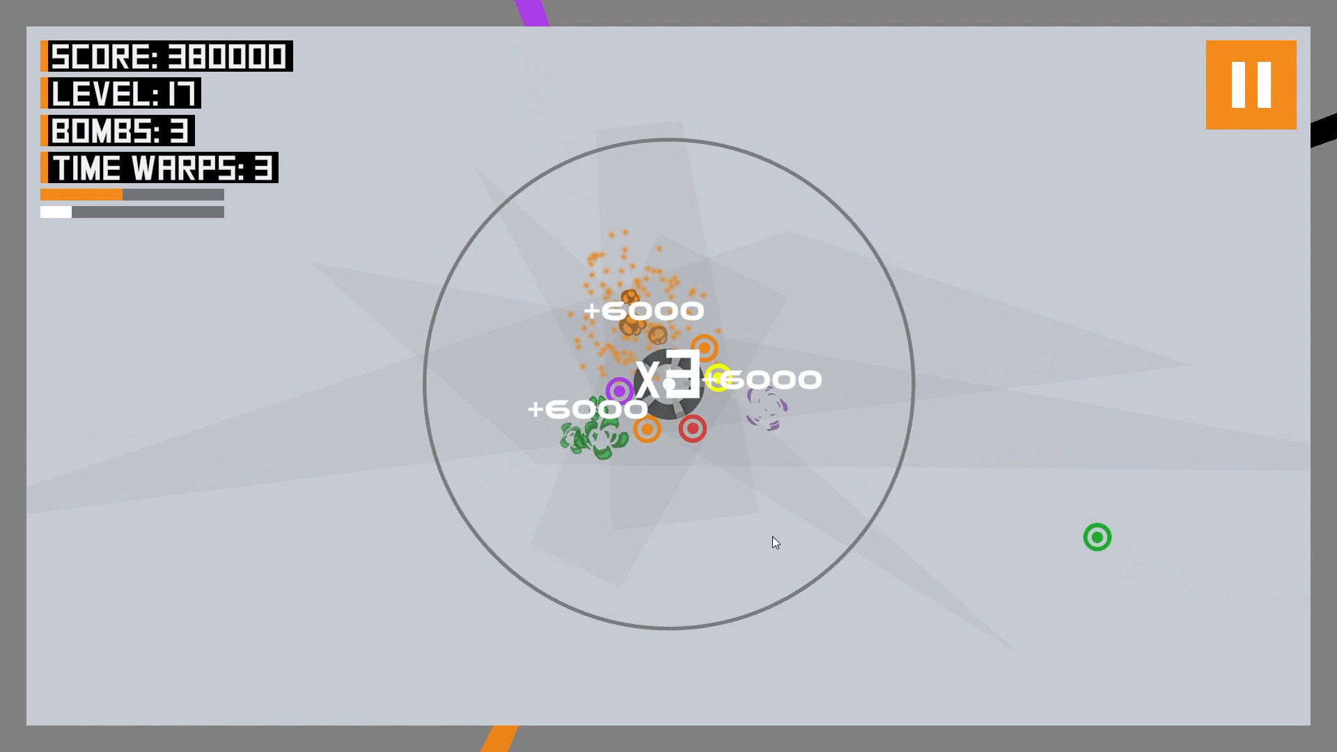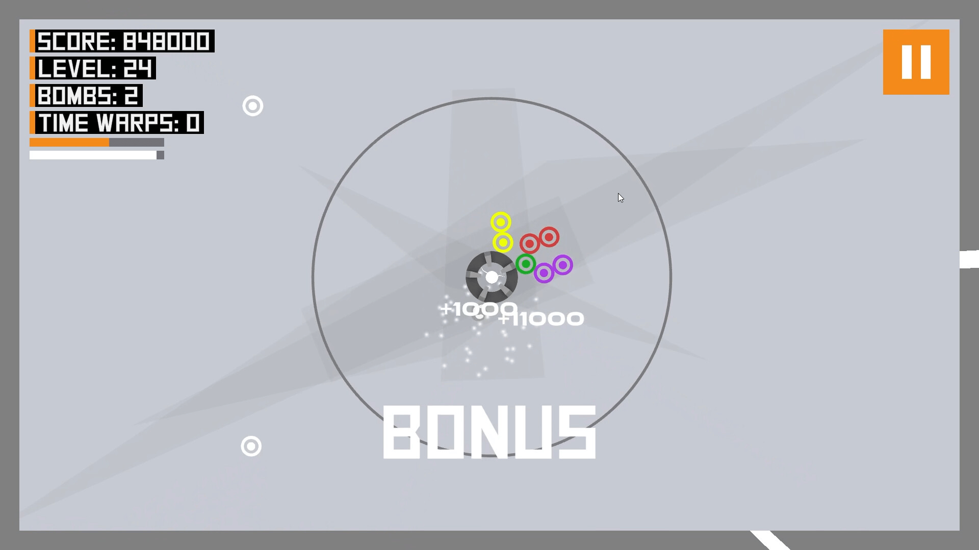 Graviton Flux is a fun action-packed puzzle game. Differently colored particles are constantly being attracted towards the center. Rotate the center to match similarly-colored particles to make them explode and prevent them from reaching the outer ring. Try to reach the rank of Grandmaster!