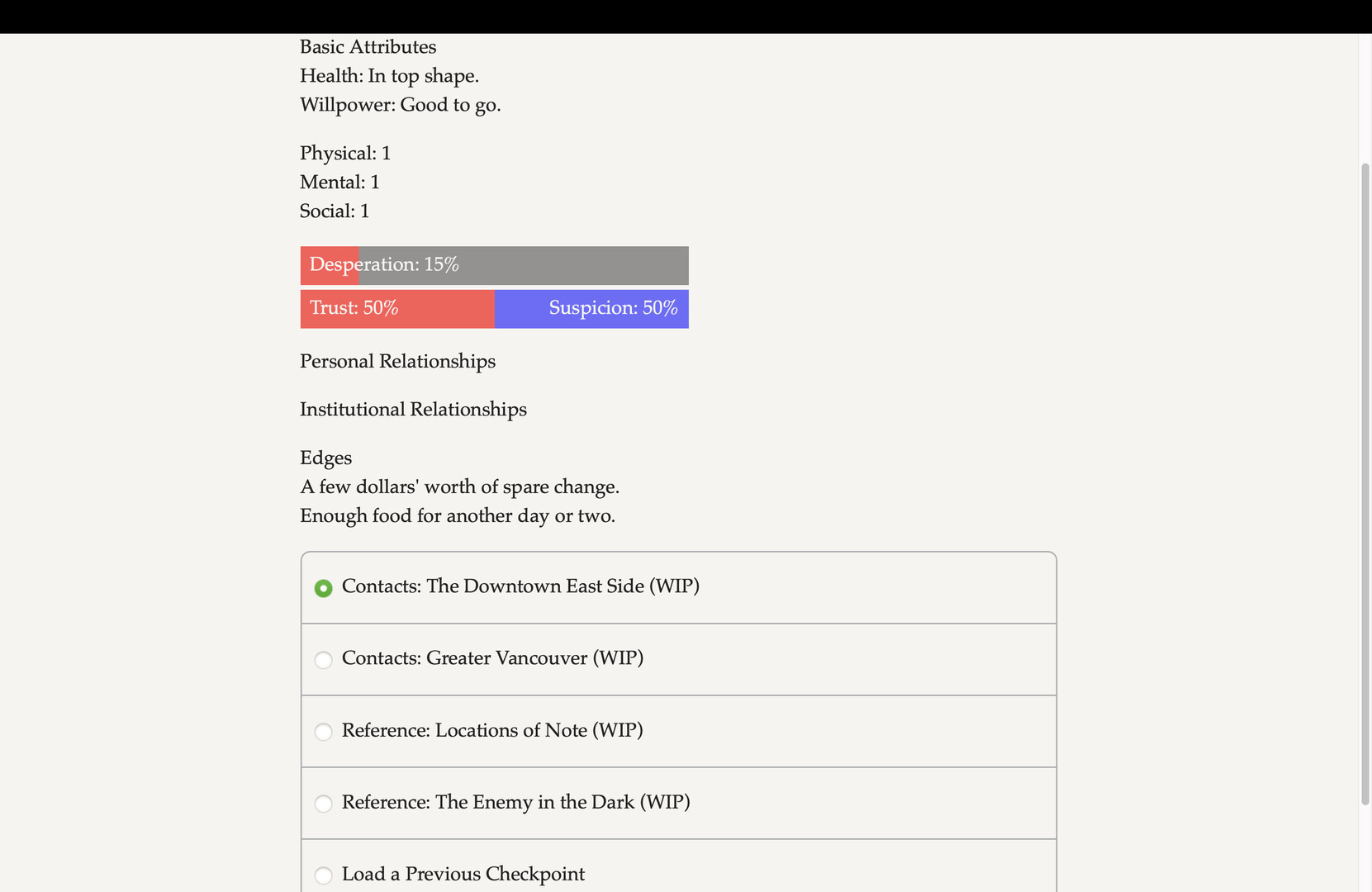 Topple the vampires from the streets below! Will you unite the homeless, the gangs, and the secret hunter societies to defy vampiric rule? An interactive novel set in the World of Darkness extended universe.