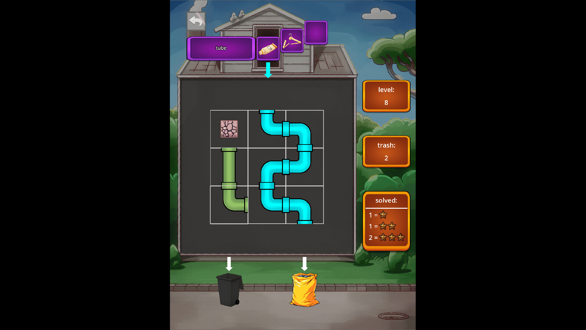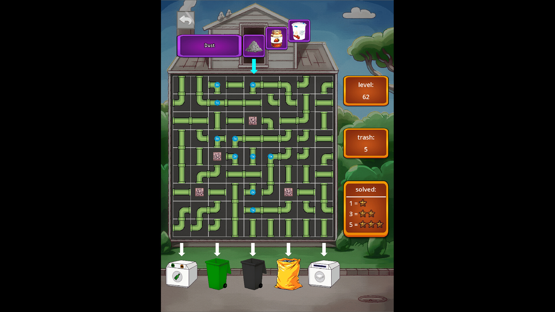 Waste Sorting is a single-player puzzle game, inspired by the classic pipe games from the 80s and 90s. Click the pipes to turn or switch them and create a way from start to finish.