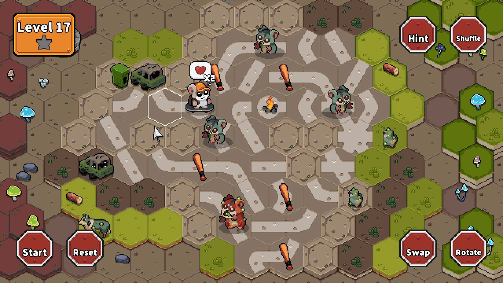 Cookie’s Trails is a cozy tactical puzzle set in a post-apocalyptic world with a sweet twist. The player guides a friendly hamster survivor through zombie-filled trails, collecting baseball bats and medical kits to safely reach the camp.