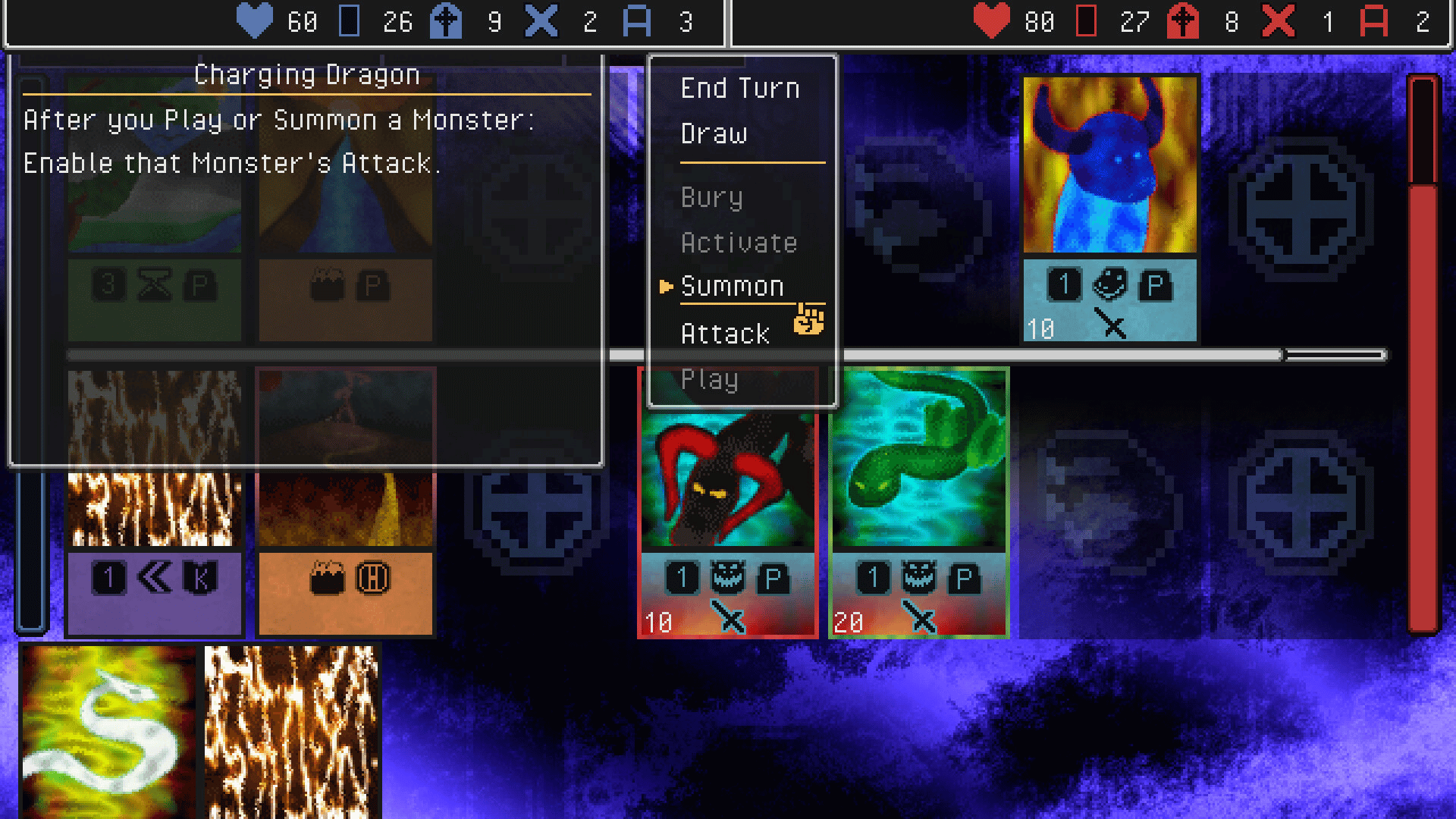 Battle against your friends online or computer controlled enemies in this digital card game. Play with the unique Summoning mechanic while the Action point system keep turns short and impactful. Unlock new cards by playing to build decks with varied strategies.
