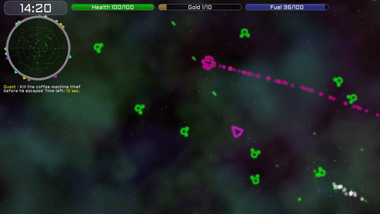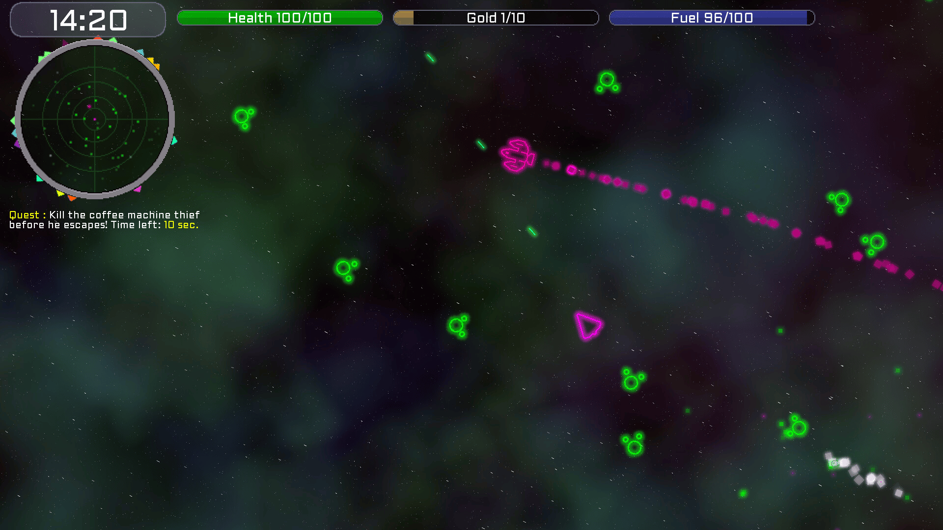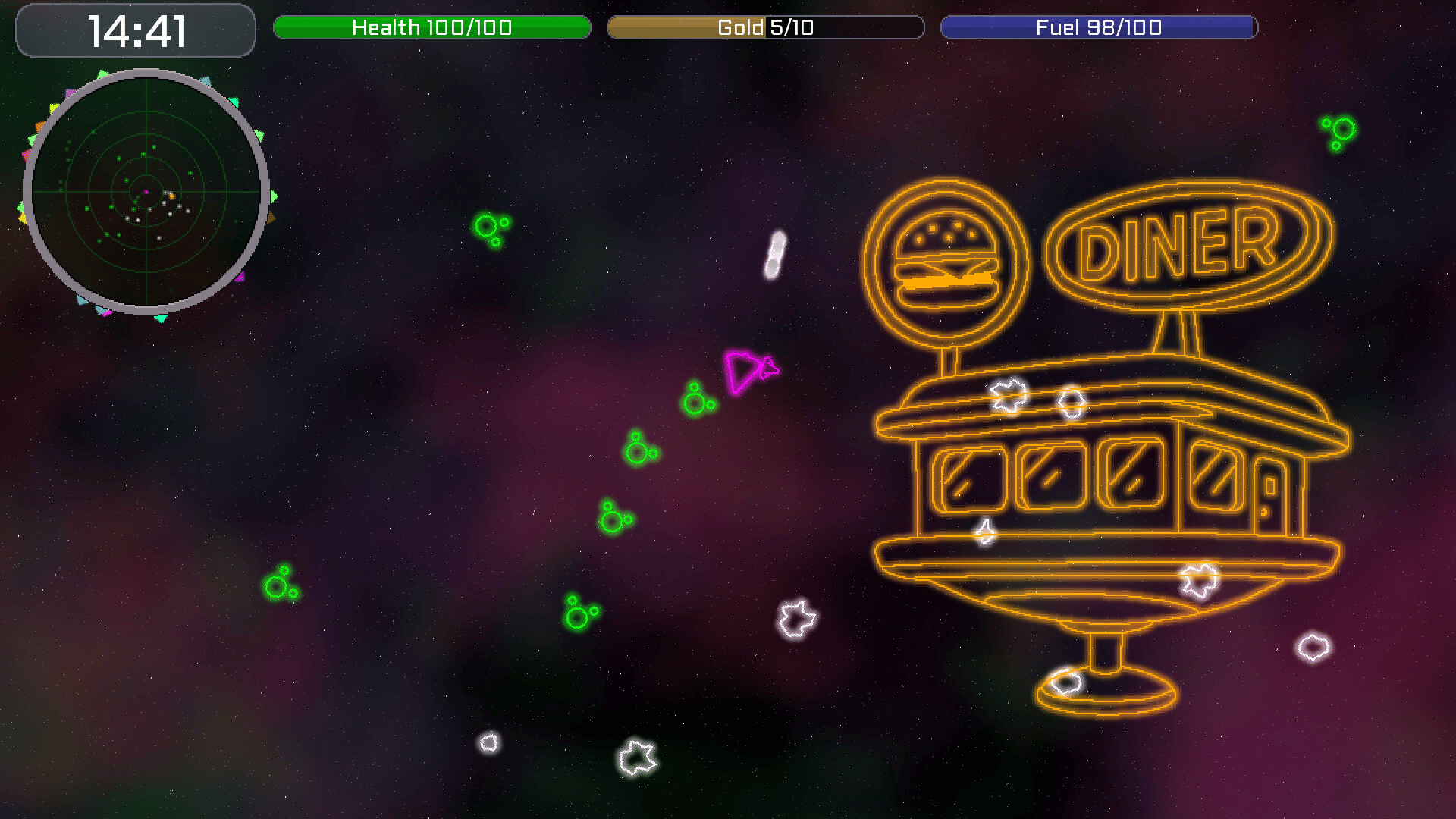 Survive 15 minutes of neon space chaos in this fast-paced top-down arcade shooter with a twist of Asteroids. Blast through swarms of geometric enemies, complete quirky quests, and upgrade your ship with absurd weapons in a Jetsons-style galaxy brimming with danger, glow, and humor.