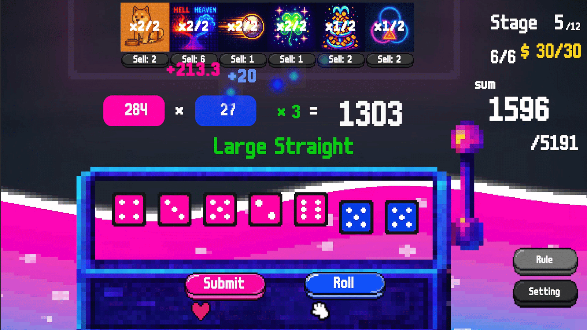 A Yacht-roguelike fusion!Roll waves of dice to form classic Yacht hands and unleash explosive synergies that skyrocket your score.Spend coins each stage to upgrade your deck, chase the top spot, and feel the thrill of soaring numbers—play now!
