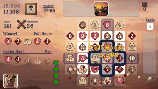A poker-infused tile-puzzler with the strategic depth of a roguelike deck-builder. Hunt notorious Bandits and break their curse by combining Jokers and upgrades to create the 10 best poker hands in a 52-card deck. Shop wisely between rounds to build a formidable deck and winning strategy.