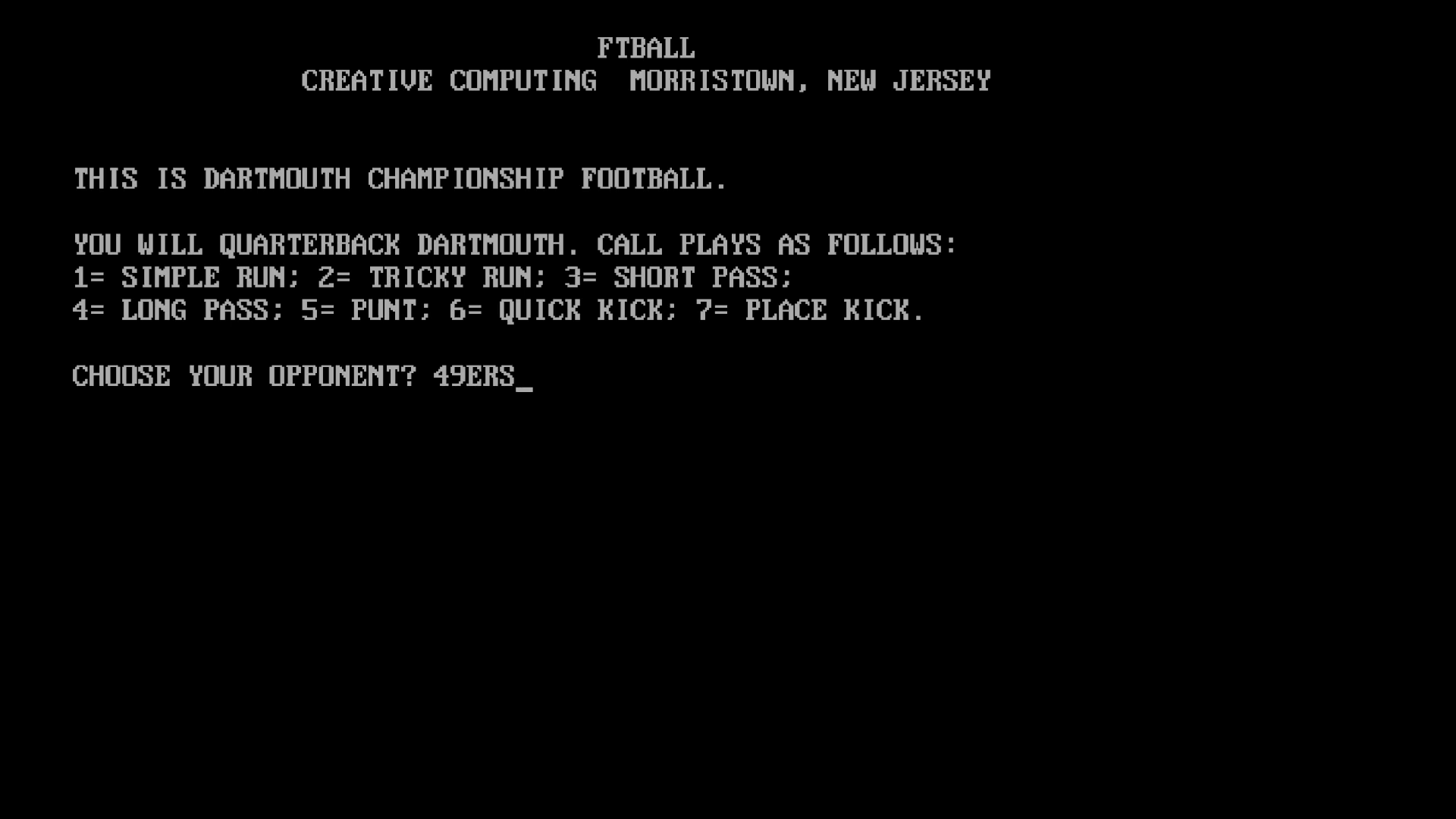 An early computer simulation of American Football, written in BASIC. Players have a choice of offensive plays, and the game also incorporates many official rules, including penalties and the safety rule. Sometimes a dog will run on the field, interrupting play.