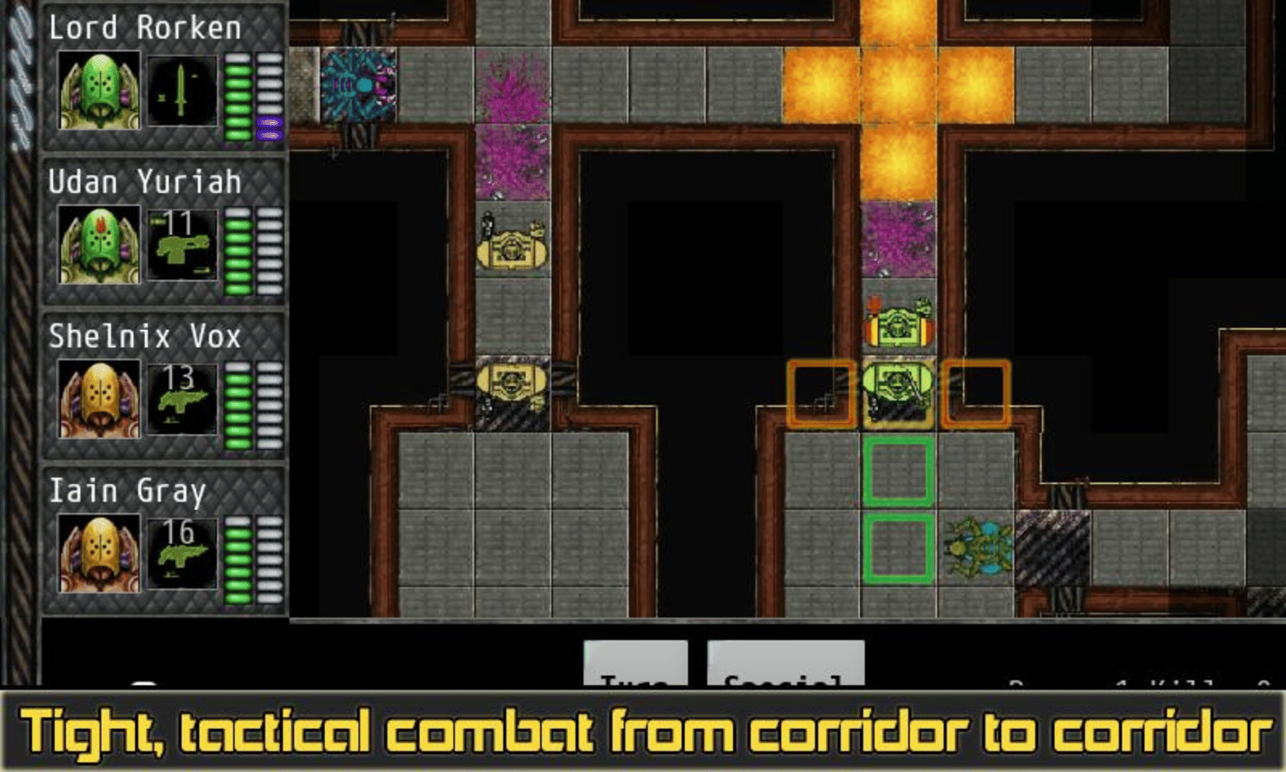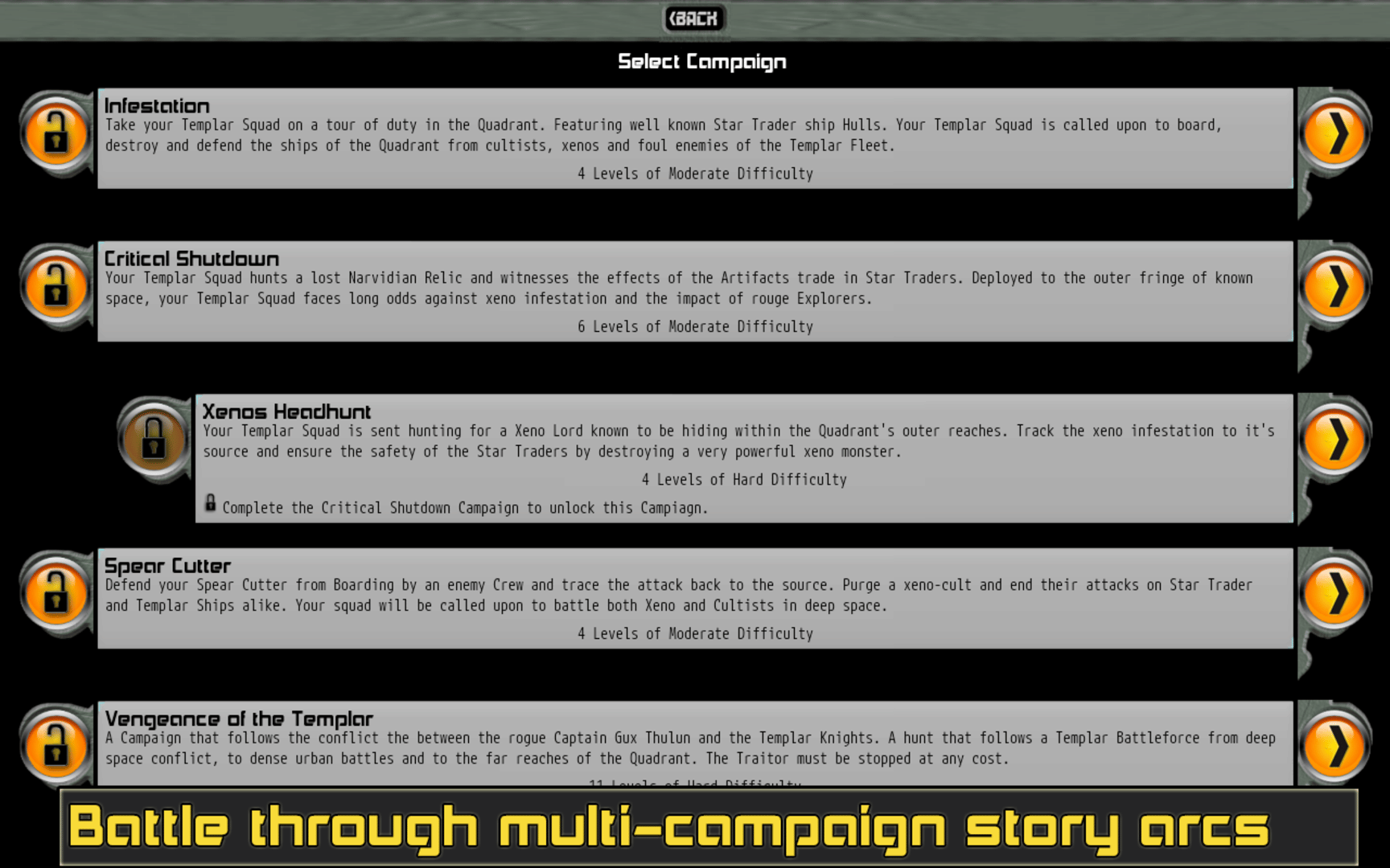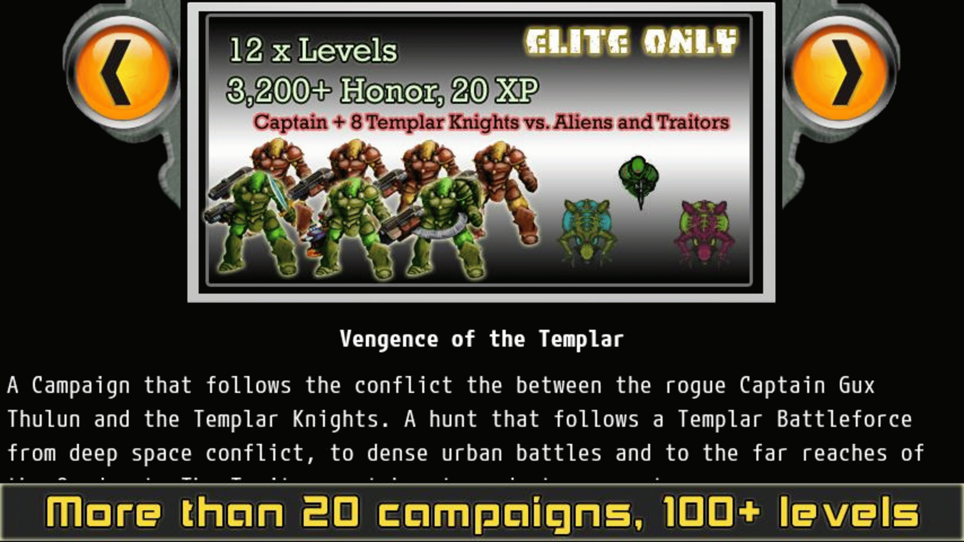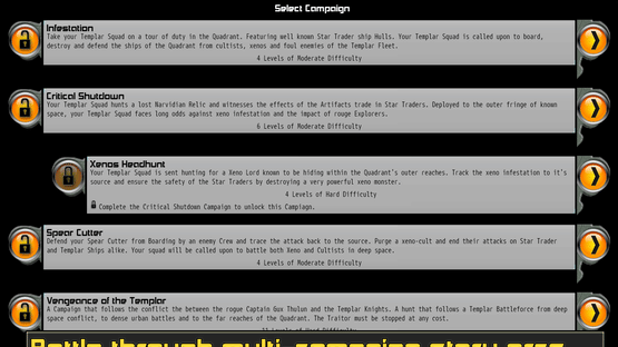 Command your elite squad of Templar Knights in close-quarters tactical combat against the terror of the alien. Fighting in the tight spaces of starcraft, ancient mines, forgotten temples, and derelict space ships your Templars will face aliens, xenoforms, forgotten evils, ancient constructs, pirates and mad cultists.