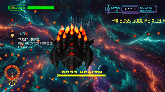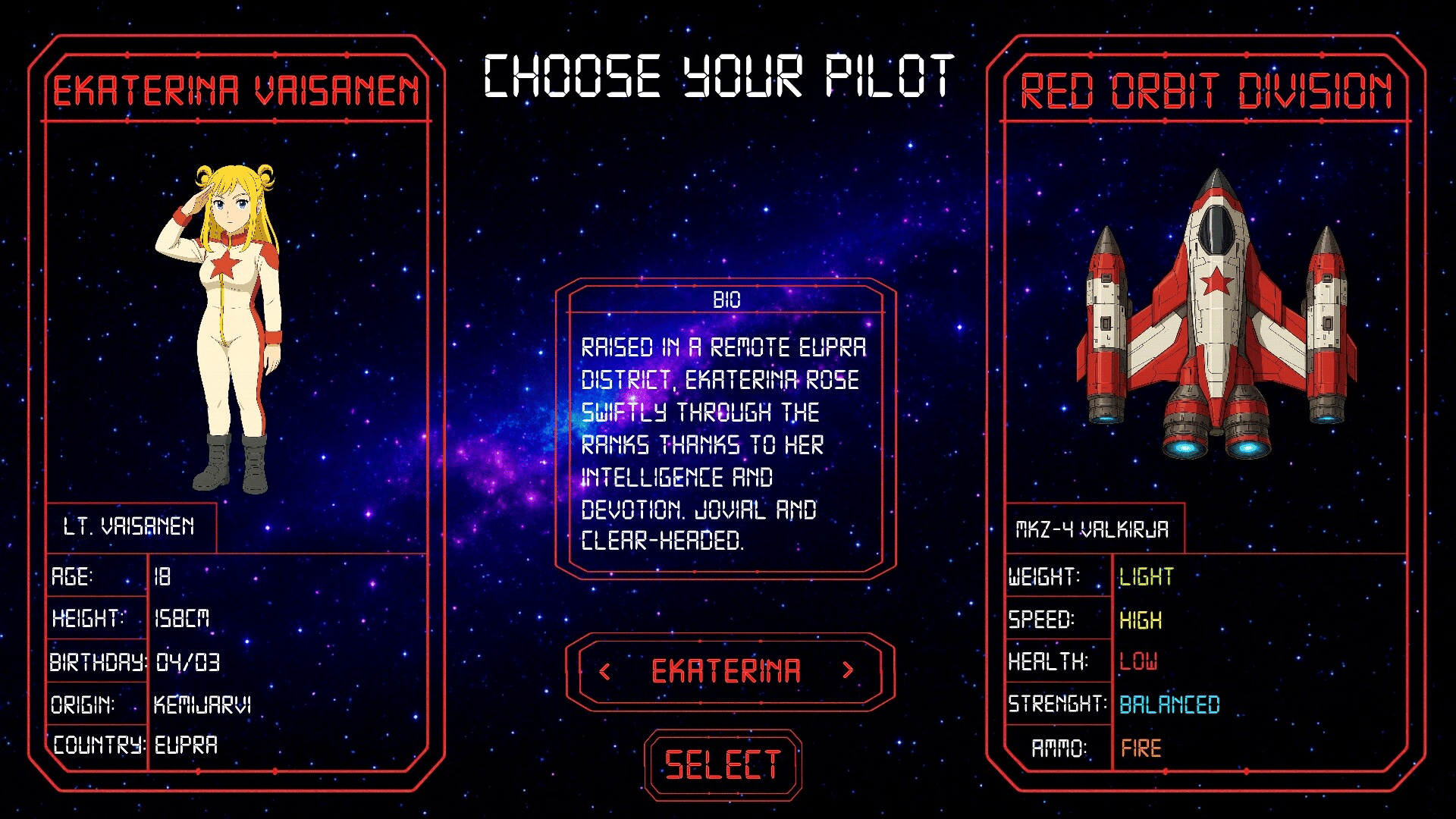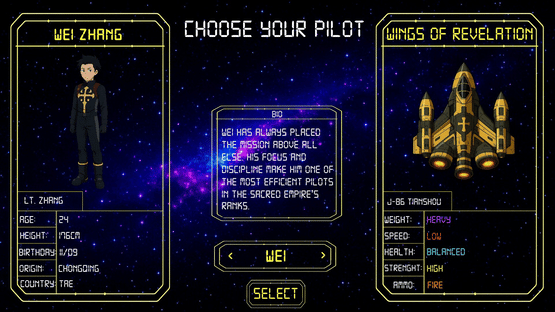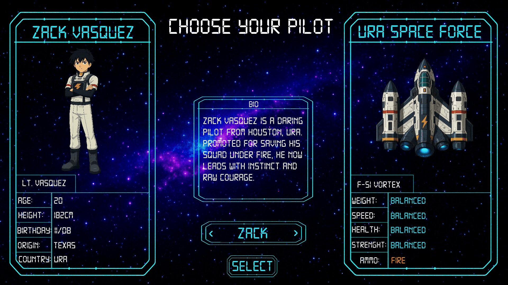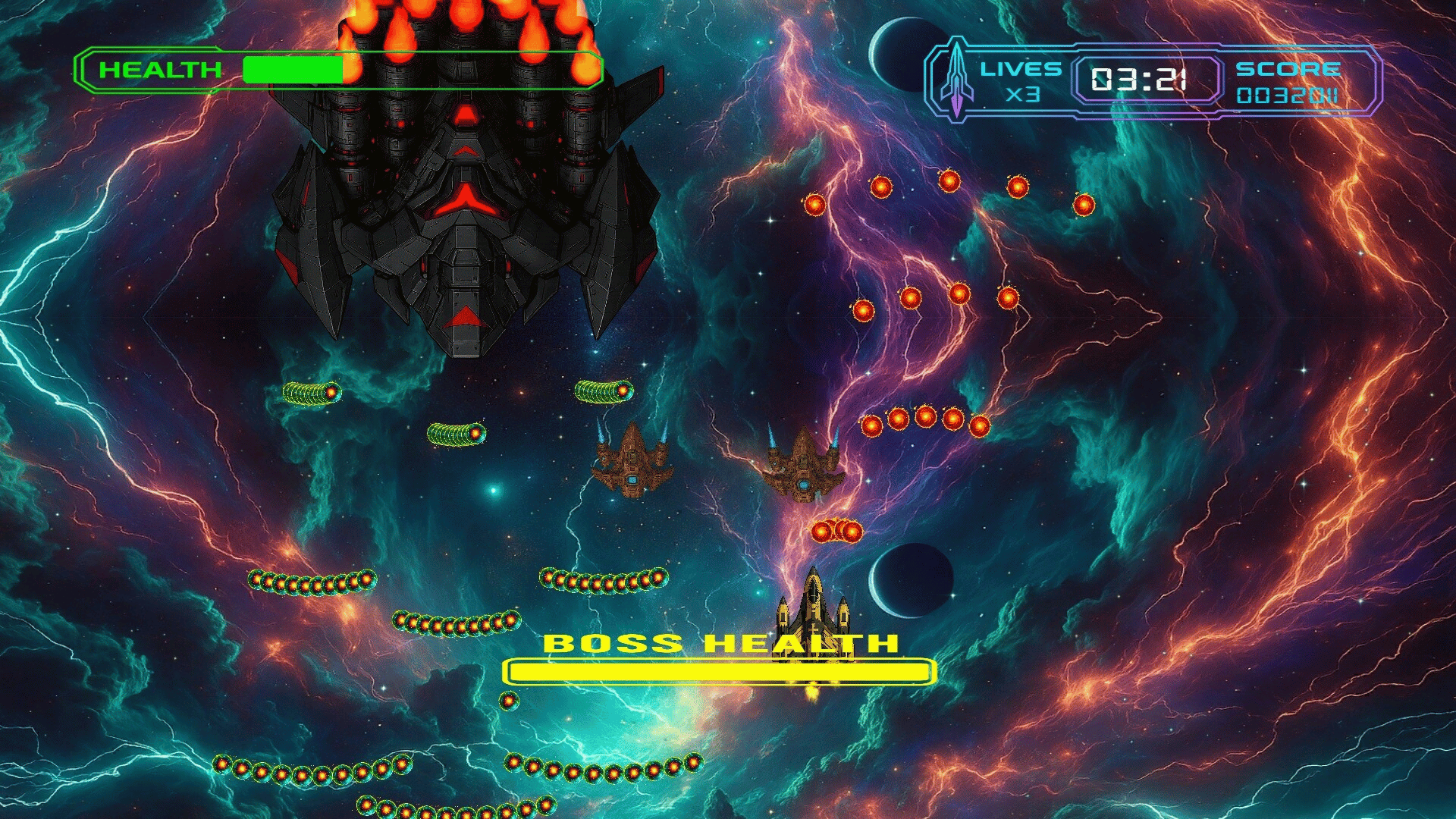 Precision bullet-hell shmup with dual-element weapons, two tight-window shields, reactive in-mission dialogue and multi-phase bosses. Lead three rival aces united against the theocracy of Zael Aether.