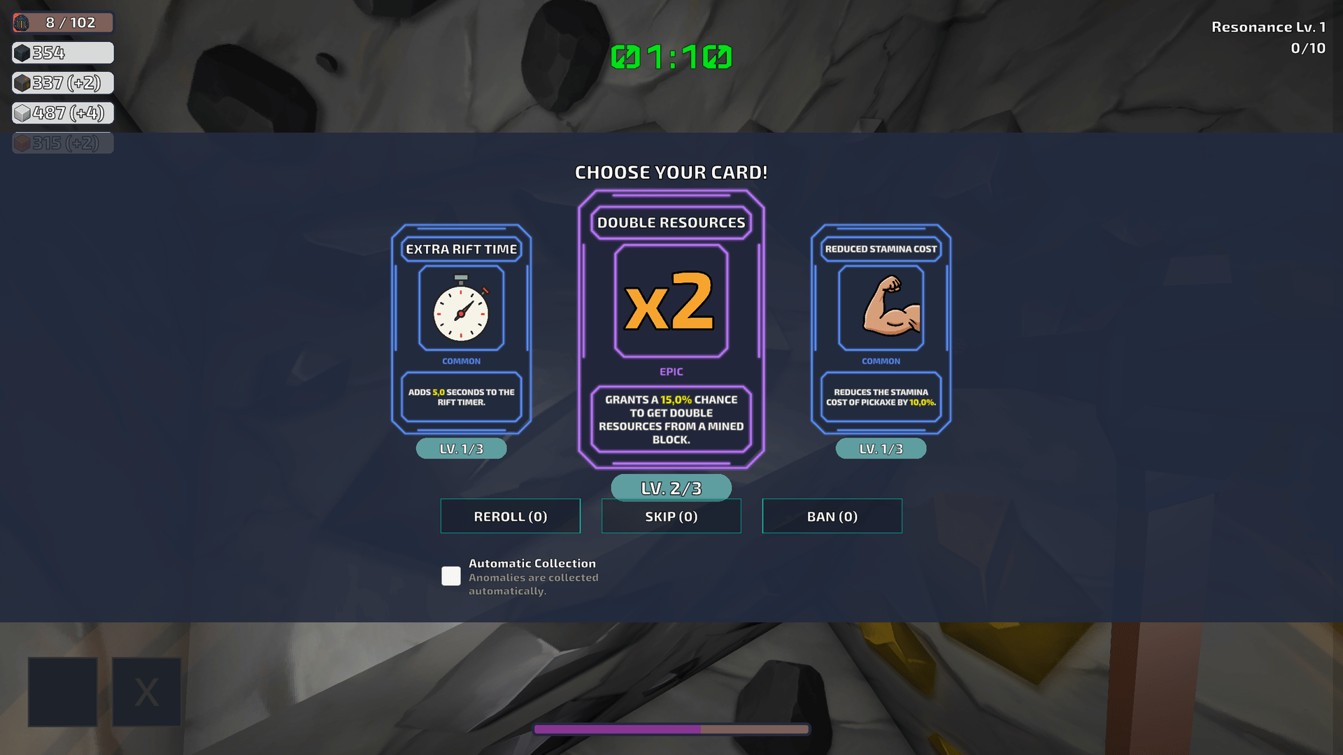Rift Miner is a 3D voxel roguelite: mine resources against the clock, escape through the portal, and invest your haul in permanent upgrades. Unlock Echo Cards for powerful synergies. Brave the high-risk Deeper Rifts for even greater rewards.