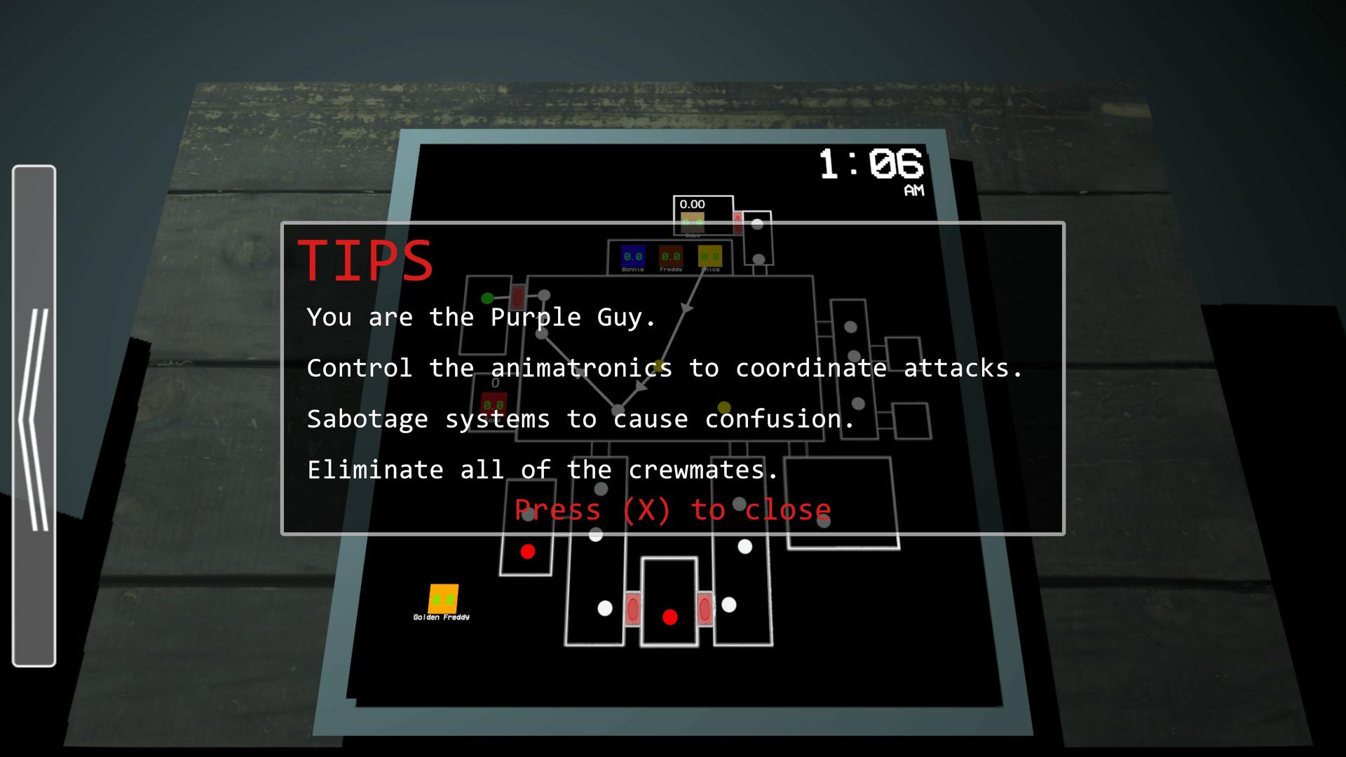 An online multiplayer fangame of Five Nights at Freddy’s 1 where 3-5 players each occupy their own office and must collaborate via in-game voice chat to survive the night. One player can also assume the role of the Purple Guy, controlling animatronics to eliminate the others before 6AM. Currently in alpha, available for Windows via GameJolt and Itch.