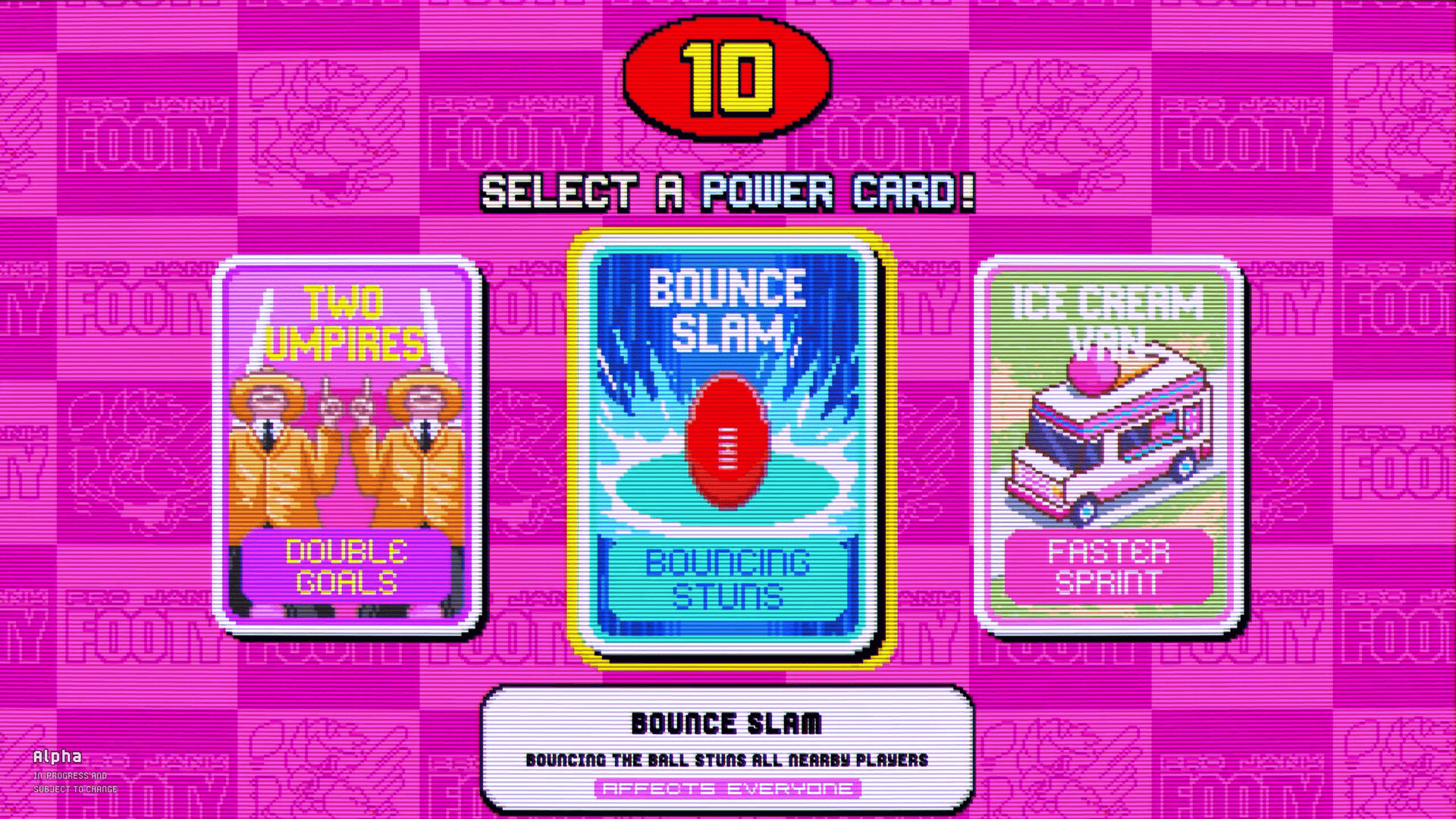 Pro Jank Footy is an over-the-top arcade comedy-sports game. Score goals to unleash game-changing power-ups, build a deck of absurd abilities, and tackle a season where no two matches are ever the same—solo or with your mates.