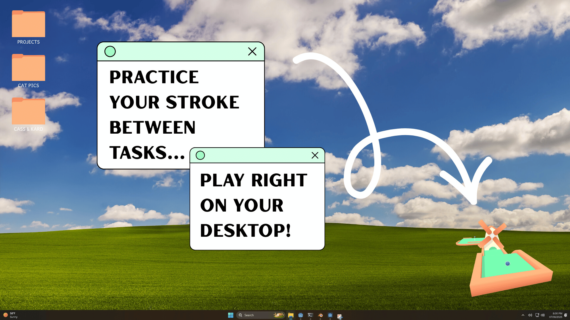 A cozy, relaxing mini golf game that floats right on your desktop. No fullscreen, no distractions - just peaceful putting whenever you want. Perfect for breaks, background play, and stress-free fun.