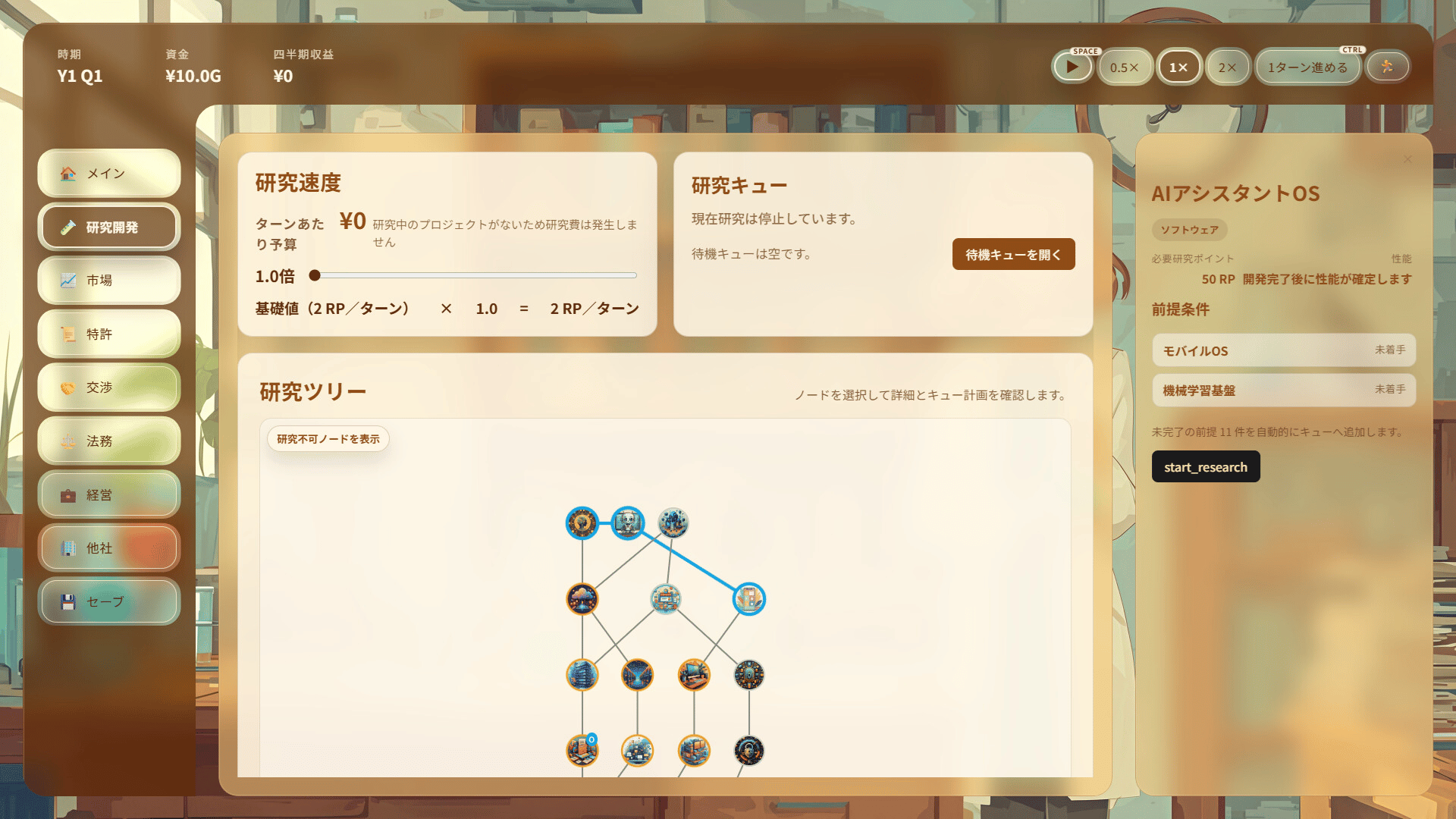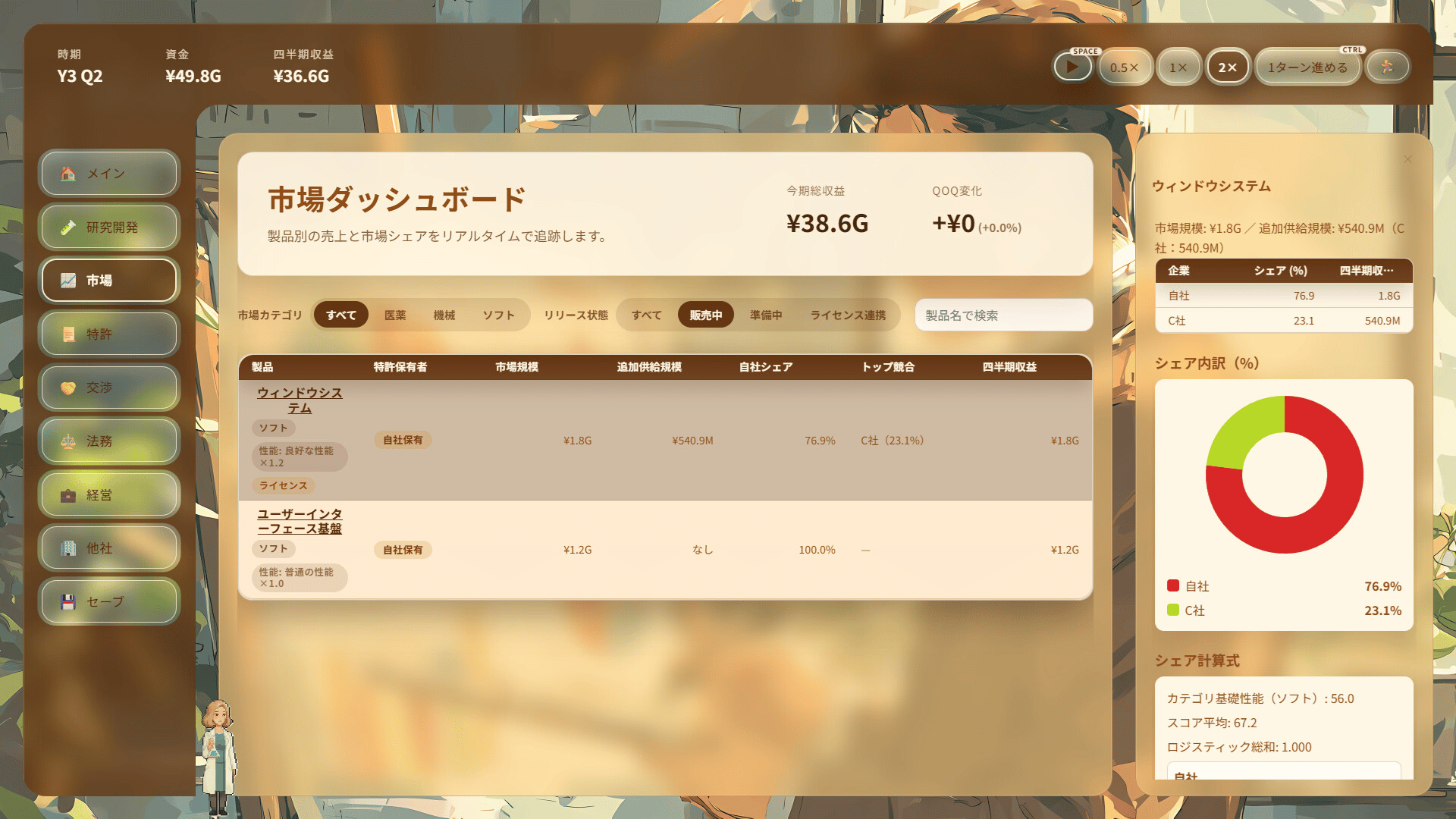 This is a management simulation game in which you develop your company by making full use of patents. Grow your company through inventions, applications, license negotiations, and litigation!